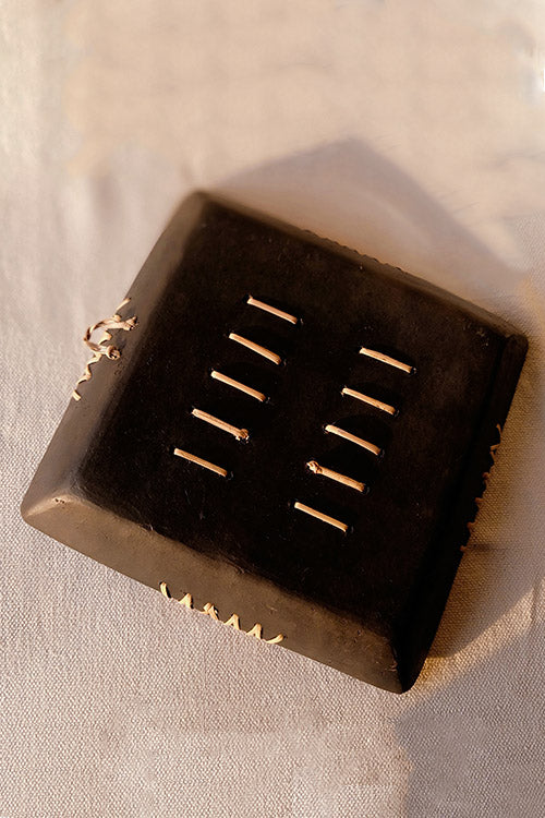 Longpi pottery from Manipur is made from a mixed paste of ground black serpentinite stone and special brown clay, which is found only in Longpi village. The pots are manually shaped, polished, sun-dried and fired in a bonfire. The black color of Longpi ham is a result of polishing the heated earthen pots with a local tree leaf. "Terracota by Sachii" brings you this heritage pottery, functional as well as beautiful! Enhance your decor with this exclusively designed wall plate which has a small cane hanging built within the design! Material : Ground Serpentinite Stone + Clay, Cane Dimensions : 8x8x1 inch; Color Black + Beige Wash & Care : Wipe wih damp cloth. To be shipped within 3-5 days of placing the order.