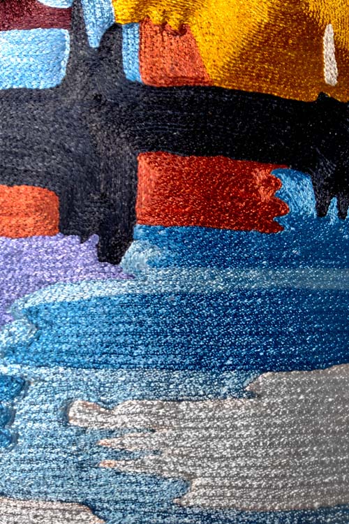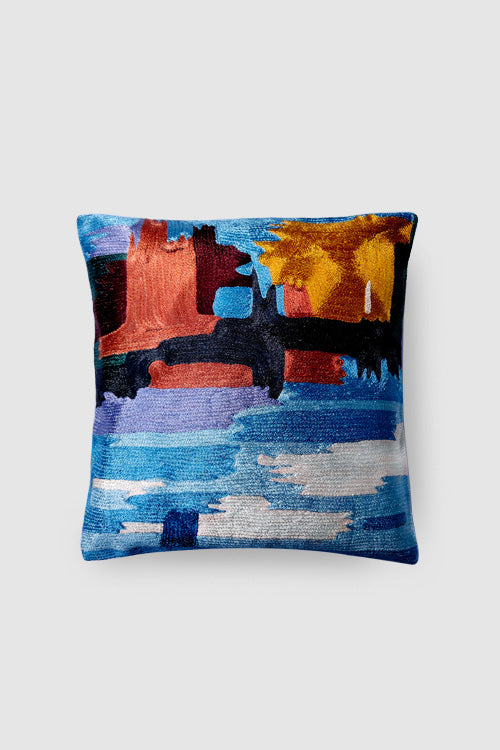 With the magnificent Dal Lake playing muse for this cushion cover, this piece captures the essence of Dal Lake in an impressionistic manner. Embroidered in chainstitch embroidery to give a look & feel of brush strokes, this piece gives you the essence of a calm and cool surrounding of the Dal Lake through the colour palette used on this cushion cover, evoking the same feel when you add it to your space. This piece has been hand embroidered using high quality silk threads on a cotton base with two wooden buttons at the back to secure the cushion.