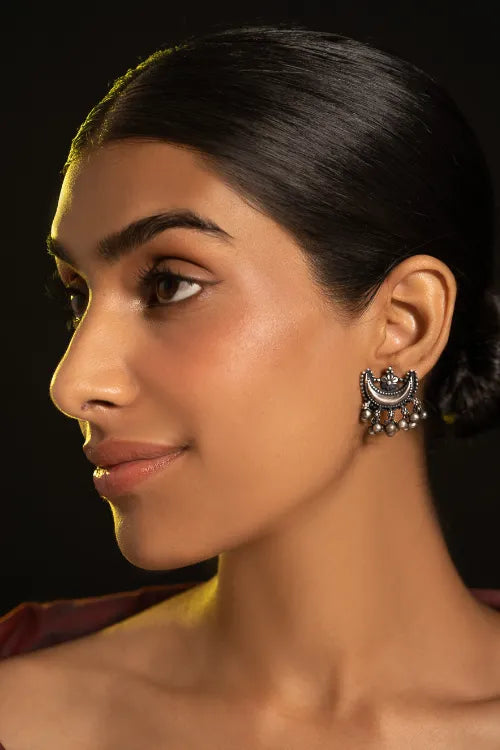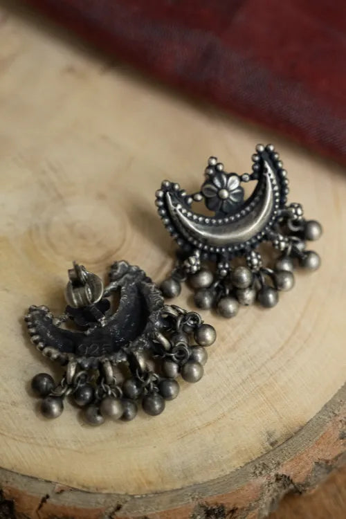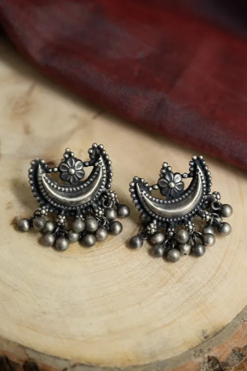 Pure Silver Traditional Maharashtrian Earrings - Ardhachandra. A delicate bloom crowned on the crescent moon. Every granulated bead and curved edge is meticulously hand-shaped. Delicate clusters of silver beads below echo the grace of ghungroos. The pure silver with subtle oxidised tones echo centuries-old craftsmanship while pairing effortlessly with contemporary aesthetics. This lovely piece has been beautifully crafted from pure Hallmark Silver and stands apart with its unique character. Handcrafted in Kolhapur, these designs have been inspired by traditional Maharashtrian designs. The process for the crafting of this beautiful Jewelry starts with the procurement of raw silver bricks, that are melted and alloyed only after a complete and thorough purity check is conducted on it. This alloy is then pressed into flat and thick wires and further refined to thinner wires depending on the requirements. The beads and small pieces of Jewelry are further crafted by skilled artisans in a precise and painstaking process.