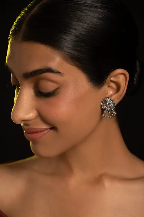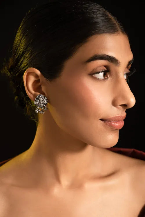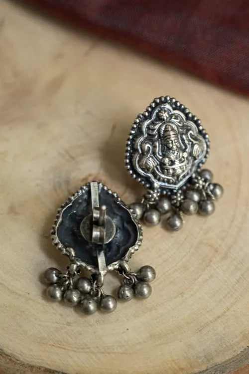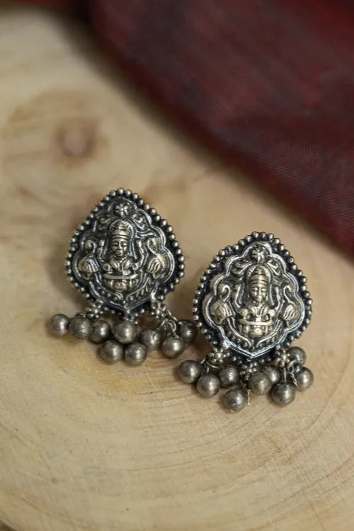 Pure Silver Traditional Maharashtrian Earrings - Devyani Studs. Finely detailed Goddess intricately embossed in oxidised silver. Framed in ornate repoussé work radiating quiet reverence and cultural richness. Dangling ghungroo beads add a rhythmic charm. This lovely piece has been beautifully crafted from pure Hallmark Silver and stands apart with its unique character. Handcrafted in Kolhapur, these designs have been inspired by traditional Maharashtrian designs. The process for the crafting of this beautiful Jewelry starts with the procurement of raw silver bricks, that are melted and alloyed only after a complete and thorough purity check is conducted on it. This alloy is then pressed into flat and thick wires and further refined to thinner wires depending on the requirements. The beads and small pieces of Jewelry are further crafted by skilled artisans in a precise and painstaking process.