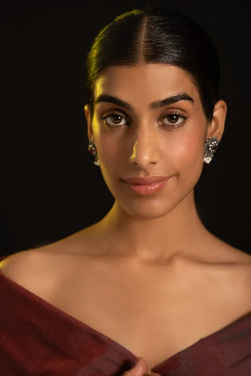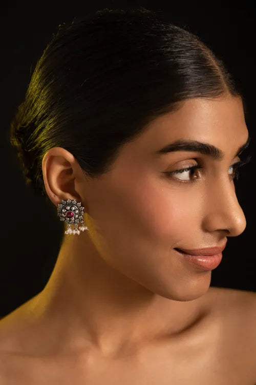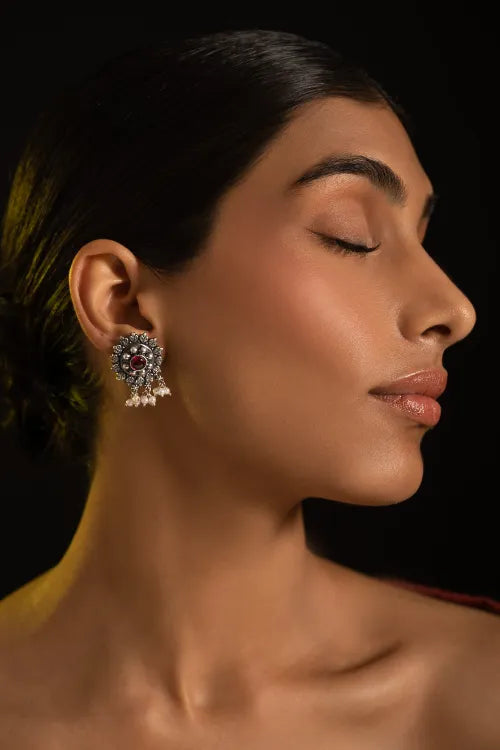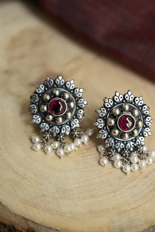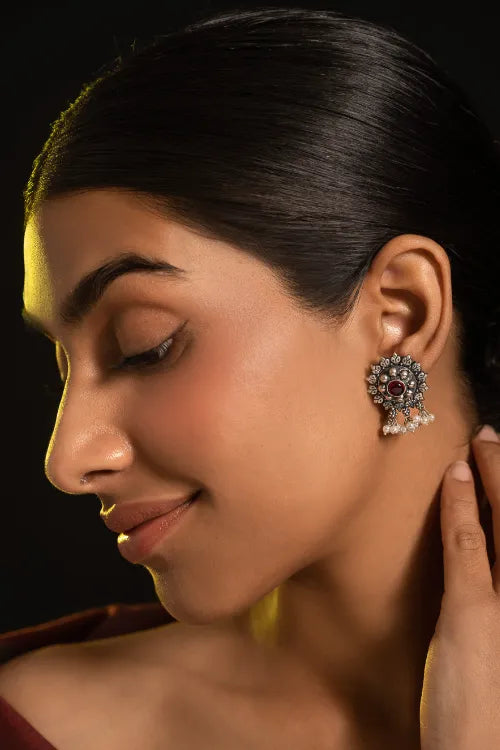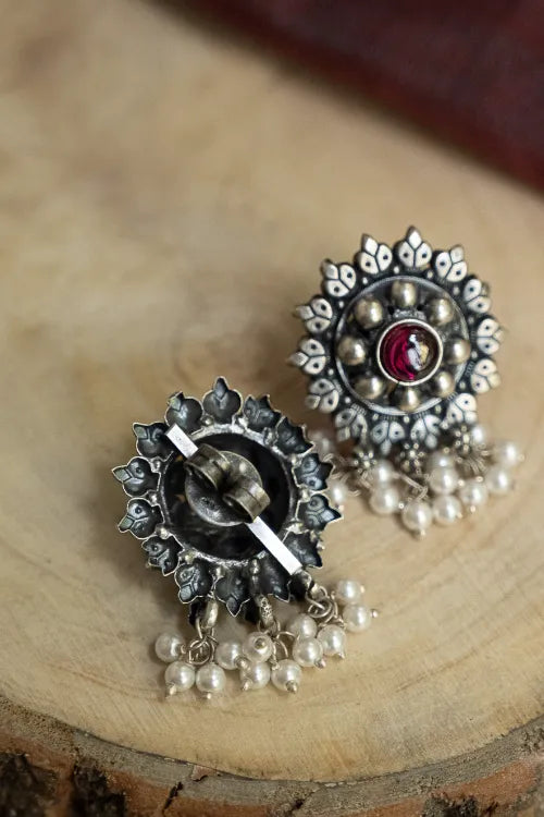 Pure Silver Traditional Maharashtrian Earrings - Kusum Roop. A radiant floral mandala etched in pure silver, crowned with a deep red stone at the centre. Delicate clusters of pearl-like beads cascade gently below echo the grace of ghungroos. These earrings are crafted to embody vintage grandeur and festive elegance. A collector’s piece made for heartfelt heirloom gifting or timeless celebration. This lovely piece has been beautifully crafted from pure Hallmark Silver and stands apart with its unique character. Handcrafted in Kolhapur, these designs have been inspired by traditional Maharashtrian designs. The process for the crafting of this beautiful Jewelry starts with the procurement of raw silver bricks, that are melted and alloyed only after a complete and thorough purity check is conducted on it. This alloy is then pressed into flat and thick wires and further refined to thinner wires depending on the requirements. The beads and small pieces of Jewelry are further crafted by skilled artisans in a precise and painstaking process.