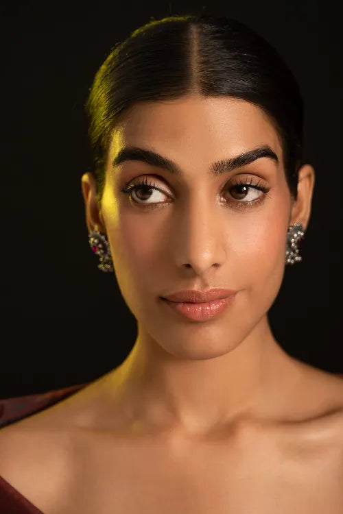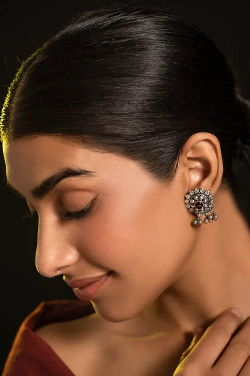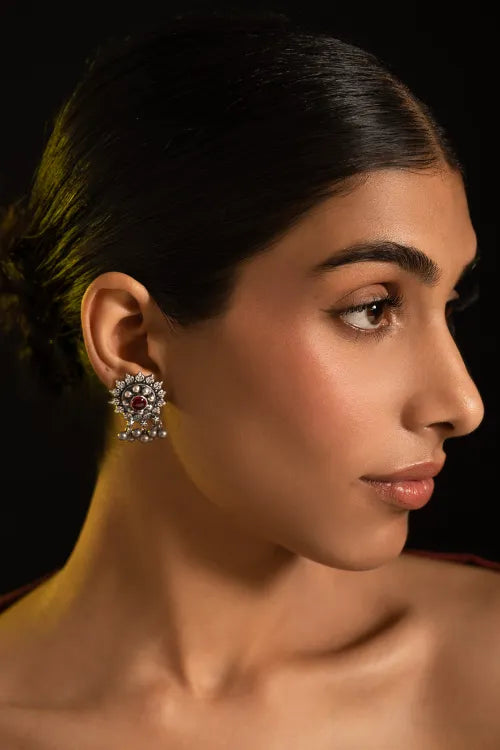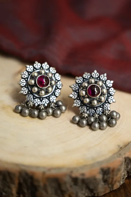Pure Silver Traditional Maharashtrian Earrings - Tarakini. A radiant floral mandala etched in pure silver, crowned with a deep red stone at the centre. Delicate clusters of pearl-like beads cascade gently below echo the grace of ghungroos. These earrings are crafted to embody vintage grandeur and festive elegance. A collector’s piece made for heartfelt heirloom gifting or timeless celebration. This lovely piece has been beautifully crafted from pure Hallmark Silver and stands apart with its unique character. Handcrafted in Kolhapur, these designs have been inspired by traditional Maharashtrian designs. The process for the crafting of this beautiful Jewelry starts with the procurement of raw silver bricks, that are melted and alloyed only after a complete and thorough purity check is conducted on it. This alloy is then pressed into flat and thick wires and further refined to thinner wires depending on the requirements. The beads and small pieces of Jewelry are further crafted by skilled artisans in a precise and painstaking process.