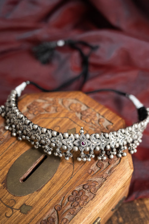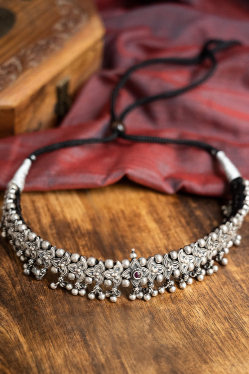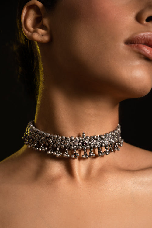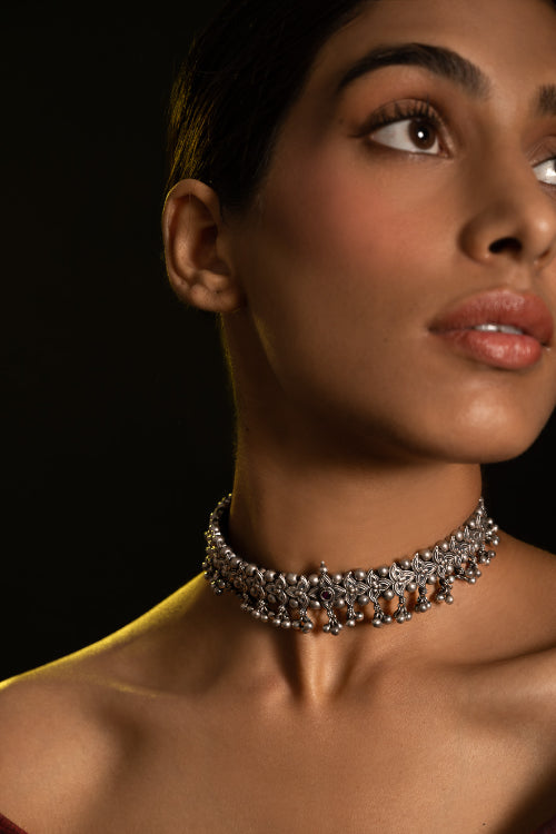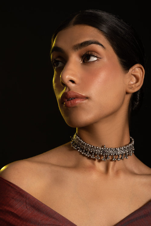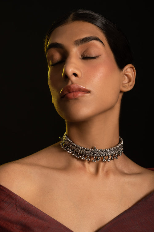 Pure Silver Traditional Maharashtrian Neckpiece - Belpaan. Subtle yet rich in character, this traditional choker speaks in the language of fine detail. A quiet composition of hand-forged vintage silver elements, it carries the unmistakable charm of a bygone era. Inspired by the robust grace of Maharashtrian ornaments, it honours a timeless aesthetic while embracing a sculptural, contemporary silhouette. This, a traditional heritage design, is an exquisite piece beautifully crafted from pure Hallmark Silver and stands apart with its unique character. Handcrafted in Kolhapur, these traditional Maharashtrian designs were mostly only crafted in pure Gold. The process for the crafting of this stunning Jewelry starts with the procurement of raw silver of bricks, that are melted and alloyed only after a complete and thorough purity check is conducted on it. This alloy is then pressed into flat and thick wires and further refined to thinner wires depending on the requirements. The beads and small pieces of Jewelry are further crafted by skilled artisans in a precise and painstaking process.