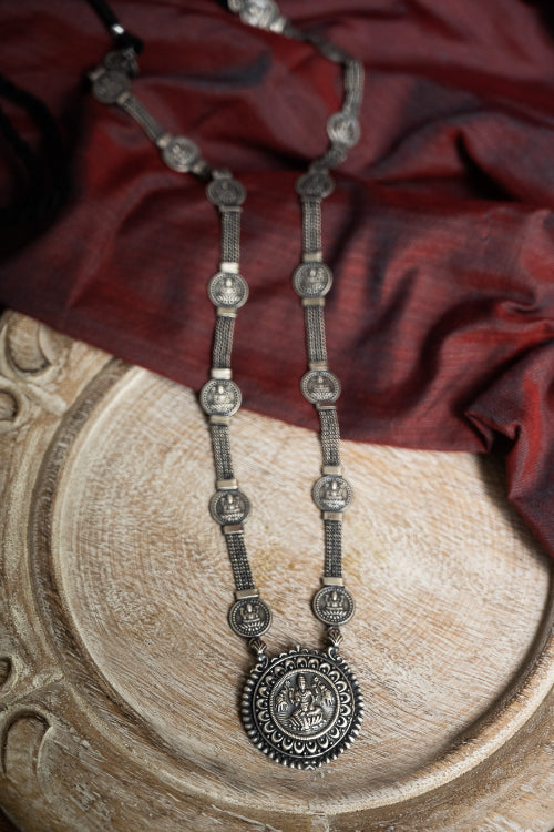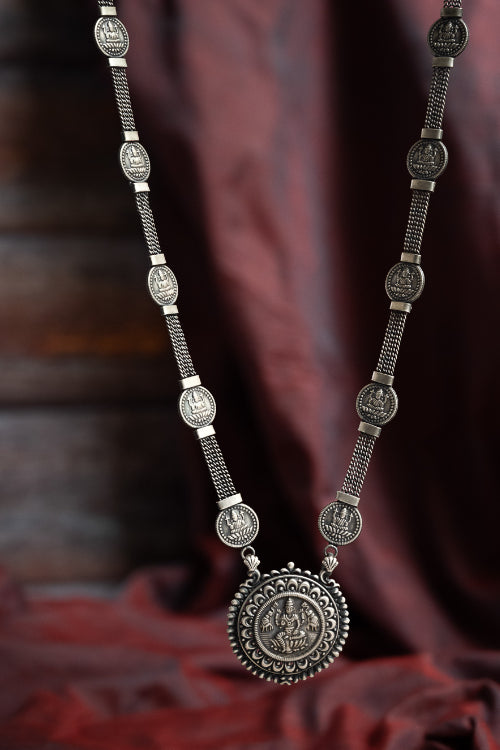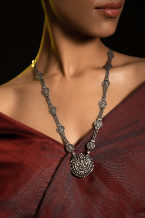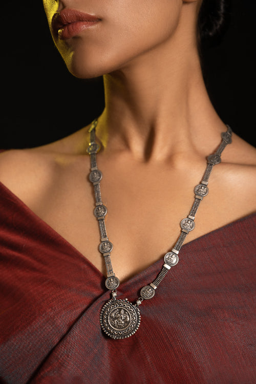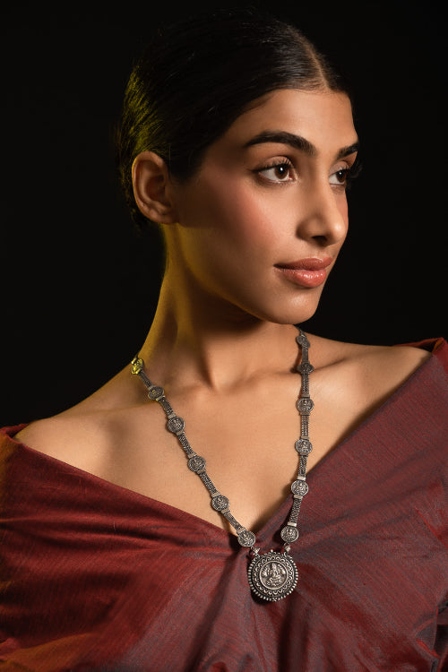 Pure Silver Traditional Maharashtrian Neckpiece - Laxmihaar. Dainty Lakshmi coins are linked with minimal silver chains, culminating in a bold central pendant that echoes the timeless form of a traditional Lakshmi coin. A traditional heritage design, this exquisite piece has been beautifully crafted from pure Hallmark Silver and stands apart with its unique character. Handcrafted in Kolhapur, these traditional Maharashtrian designs were mostly only crafted in pure Gold. The process for the crafting of this stunning Jewelry starts with the procurement of raw silver of bricks, that are melted and alloyed only after a complete and thorough purity check is conducted on it. This alloy is then pressed into flat and thick wires and further refined to thinner wires depending on the requirements. The beads and small pieces of Jewelry are further crafted by skilled artisans in a precise and painstaking process.