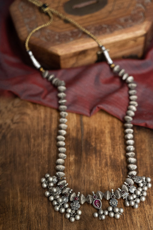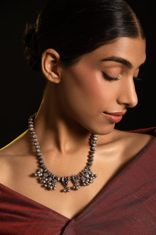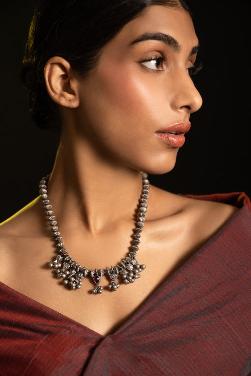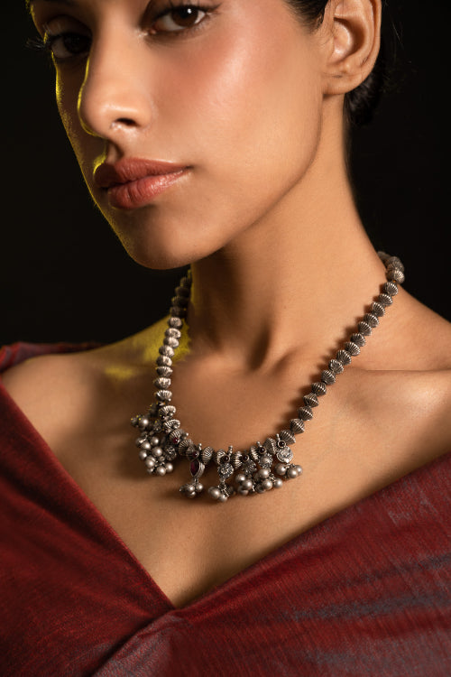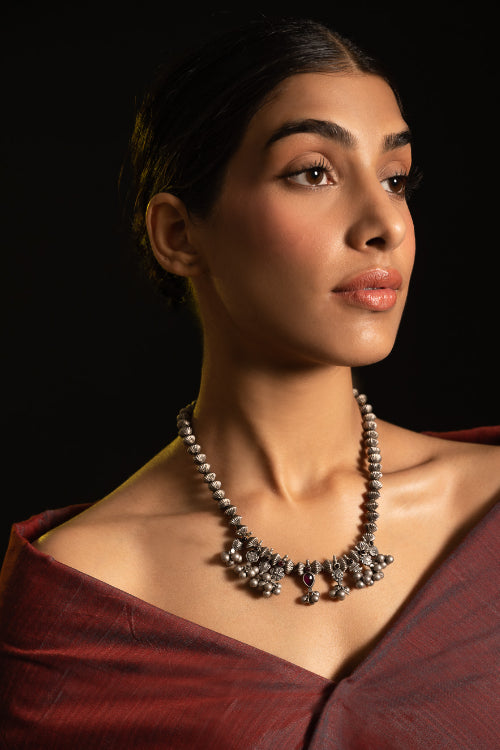 Pure Silver Traditional Maharashtrian Neckpiece - Nishka. Delicate granulation in silver here creates a soft shimmer, revealing its quiet brilliance in shifting light. Inspired by the robust grace of Maharashtrian ornaments, it honours the traditional aesthetic while embracing a sculptural, contemporary silhouette. This exquisite piece has been beautifully crafted from pure Hallmark Silver and stands apart with its unique character. Handcrafted in Kolhapur, these traditional Maharashtrian designs were mostly only crafted in pure Gold. The process for the crafting of this stunning Jewelry starts with the procurement of raw silver of bricks, that are melted and alloyed only after a complete and thorough purity check is conducted on it. This alloy is then pressed into flat and thick wires and further refined to thinner wires depending on the requirements. The beads and small pieces of Jewelry are further crafted by skilled artisans in a precise and painstaking process.