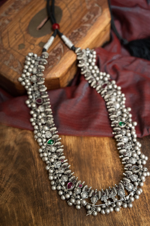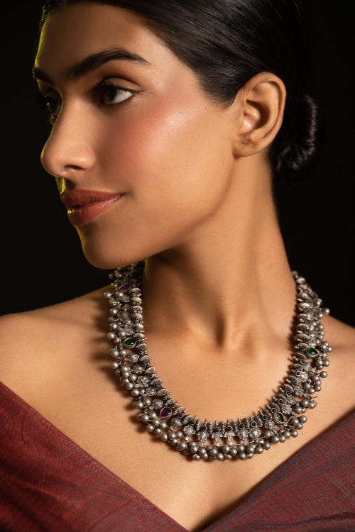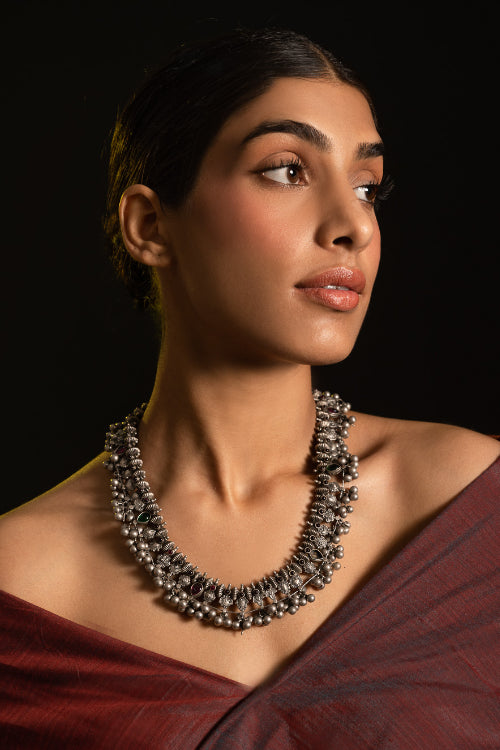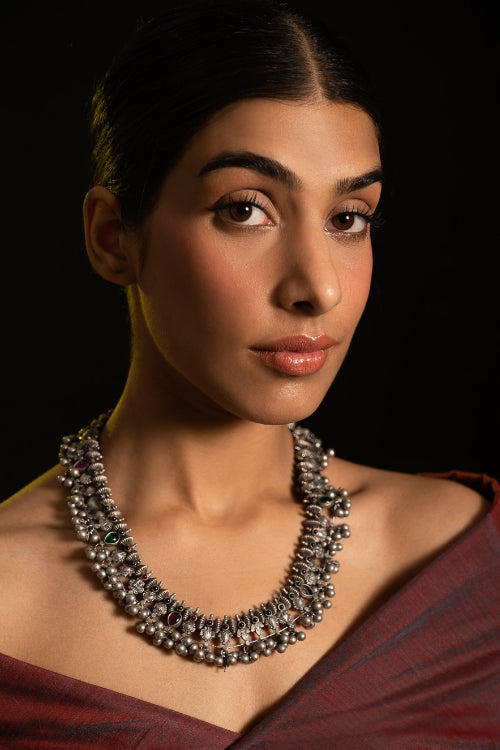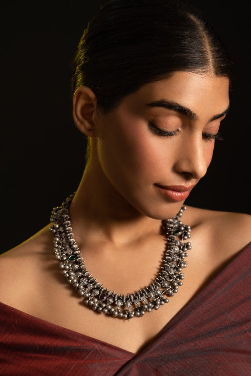 Pure Silver Traditional Maharashtrian Neckpiece - Saaz. Reproduced in Silver, this is the classic reproduction of the Kolhapuri Saaz. Hand-forged in silver, each element lends a delicate rhythm to this creation—a graceful nod to temple heritage. This traditional heritage design is an exquisite piece beautifully crafted from pure Hallmark Silver and stands apart with its unique character. Handcrafted in Kolhapur, these traditional Maharashtrian designs were mostly only crafted in pure Gold. The process for the crafting of this stunning Jewelry starts with the procurement of raw silver of bricks, that are melted and alloyed only after a complete and thorough purity check is conducted on it. This alloy is then pressed into flat and thick wires and further refined to thinner wires depending on the requirements. The beads and small pieces of Jewelry are further crafted by skilled artisans in a precise and painstaking process.