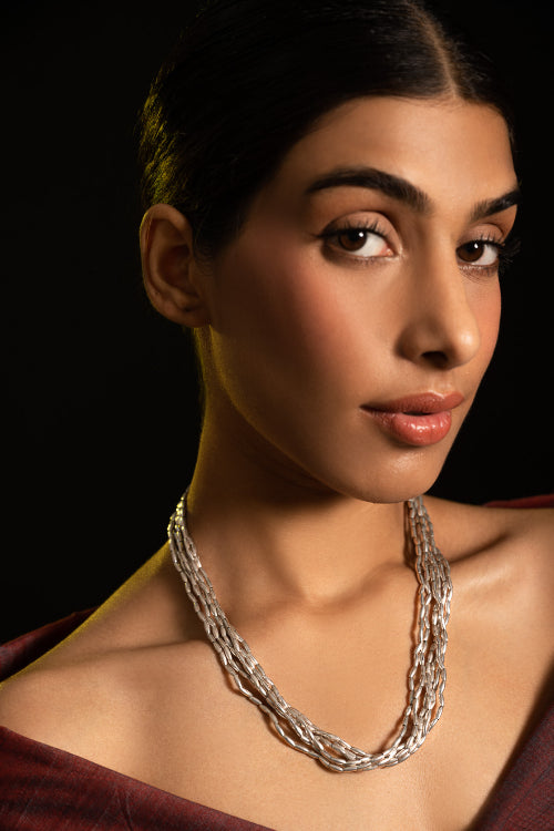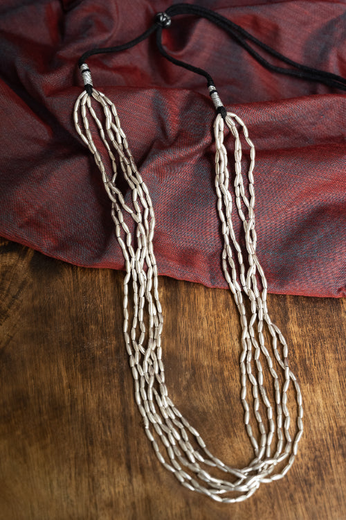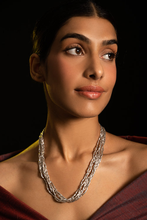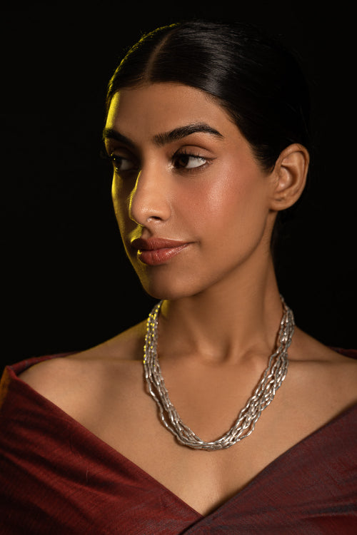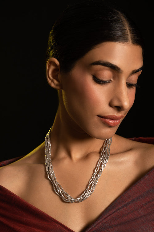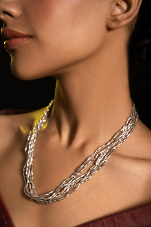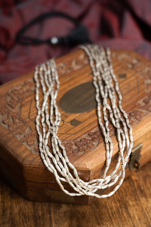 Pure Silver Traditional Maharashtrian Neckpiece - Tandulhaar. A classic reproduction of Rice grains captured in pure silver. This piece bridges trend and tradition. A traditional heritage design, this exquisite piece has been beautifully crafted from pure Hallmark Silver and stands apart with its unique character. Handcrafted in Kolhapur, these traditional Maharashtrian designs were mostly only crafted in pure Gold. The process for the crafting of this stunning Jewelry starts with the procurement of raw silver of bricks, that are melted and alloyed only after a complete and thorough purity check is conducted on it. This alloy is then pressed into flat and thick wires and further refined to thinner wires depending on the requirements. The beads and small pieces of Jewelry are further crafted by skilled artisans in a precise and painstaking process.