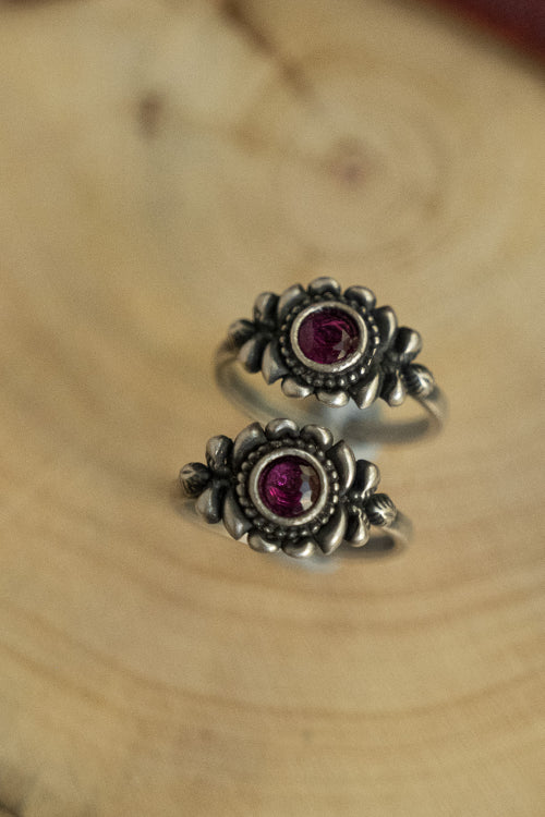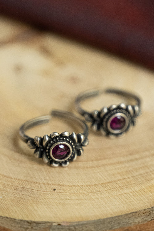 Pure Silver Traditional Maharashtrian Toe Rings - Padmaja (Set of 2). Maharashtrian silver toe ring featuring a delicate pink stone, intricately detailed with fine etchings in silver that reflect temple-inspired motifs. This exquisite piece has been beautifully crafted from pure Hallmark Silver and stands apart with its unique character. Handcrafted in Kolhapur. The process for the crafting of this stunning Jewelry starts with the procurement of raw silver of bricks, that are melted and alloyed only after a complete and thorough purity check is conducted on it. This alloy is then pressed into flat and thick wires and further refined to thinner wires depending on the requirements. The beads and small pieces of Jewelry are further crafted by skilled artisans in a precise and painstaking process.