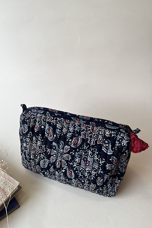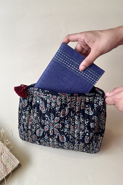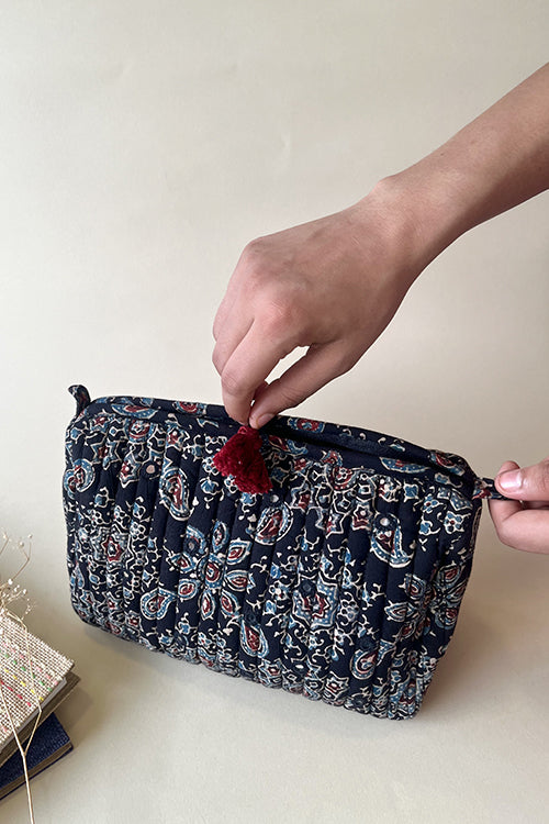 Looking for that perfect blend of tradition and style? Meet "Truffle"—the pouch that’s all about elegance with a dash of playful charm! Hand-crafted from pure black cotton fabric and adorned with vibrant hand-block printed motifs, "Truffle" showcases hand-embroidered mirrors that twinkle like tiny stars. The playful tassels add just the right amount of flair. Inside, a soft lining and secure zipper keep your essentials cosy. Ready to be always on-the-go with your necessities by your side?