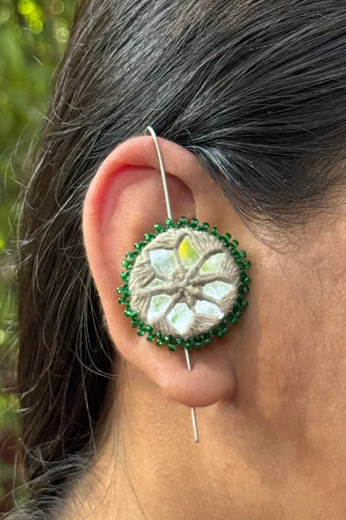 Material - 100% cotton permium Anchor threads, Glass beads, Mirrors, 100% Silver hooks for earings