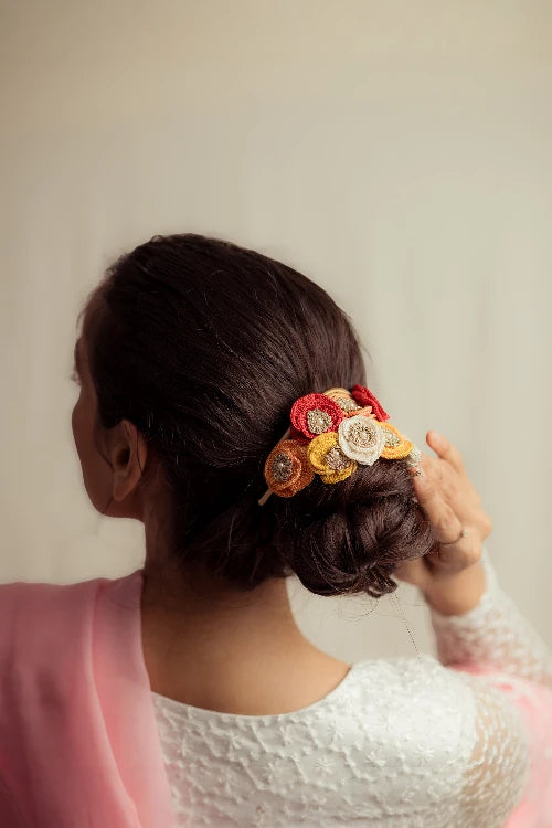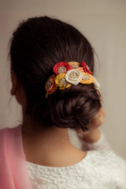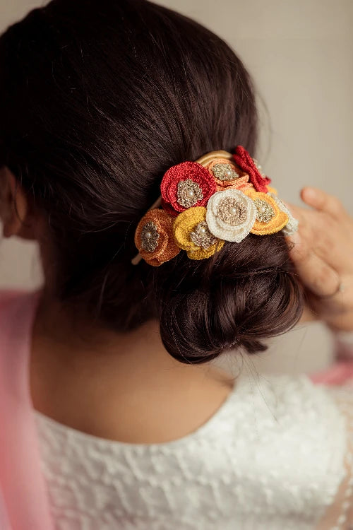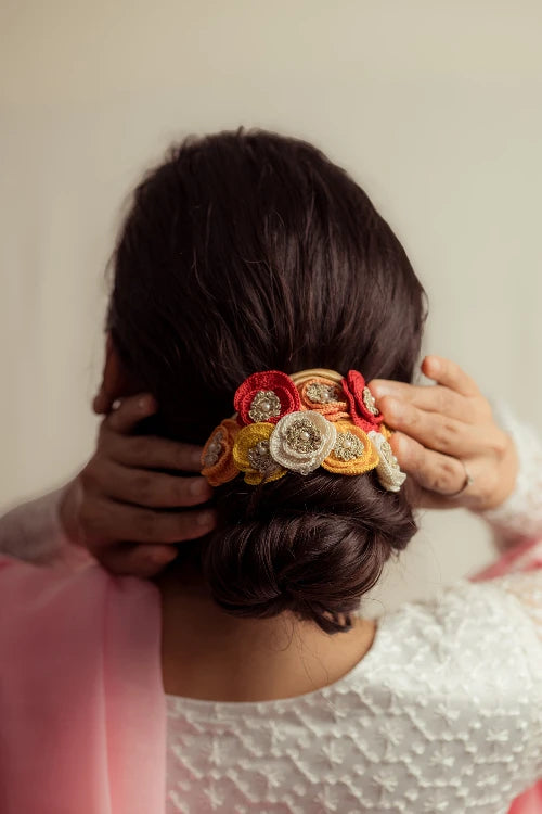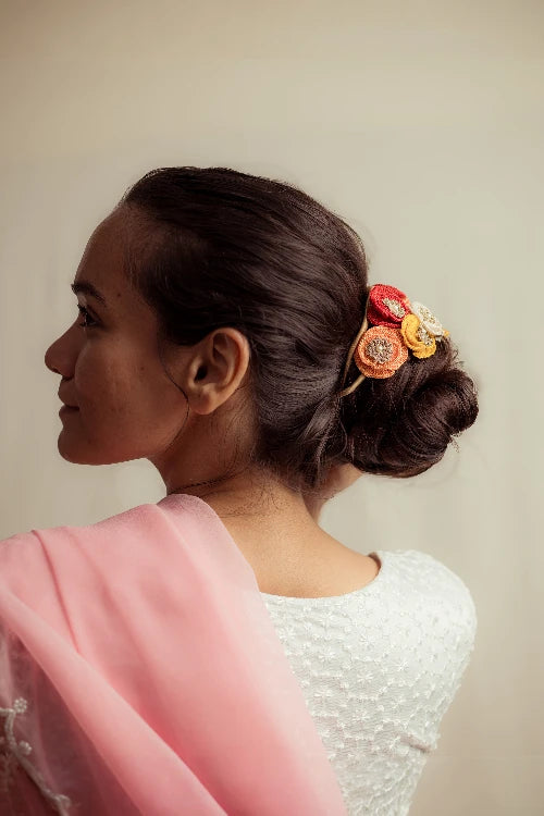 There’s a quiet romance in the way flowers have always found their place in our lives, tucked into braids, worn at celebrations, offered in prayer. Our gajra is a tribute to that enduring tradition, inspired by the floral adornments cherished by women. Every flower is shaped and strung by hand, crafted with the same care that goes into age-old rituals of beauty and belonging. You can wear it in your hair, wrap it around your neck or wrist, or drape it gently on a bun however, you choose, it carries with it a whisper of heritage, softness, and everyday poetry.