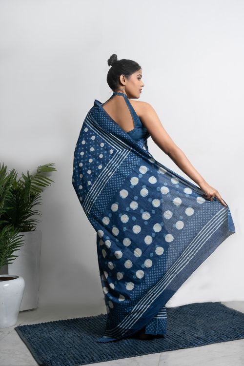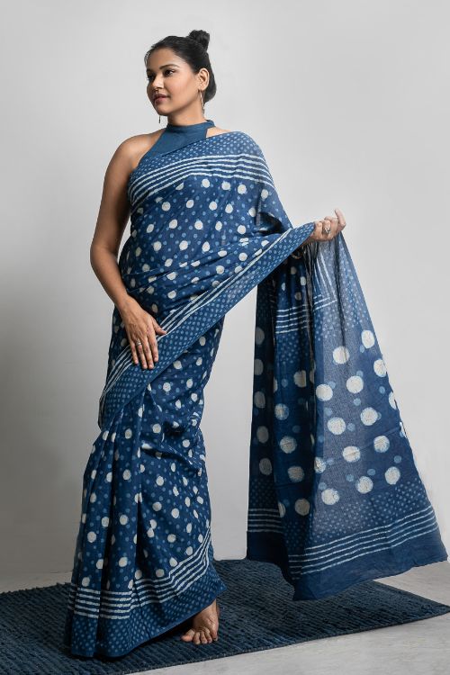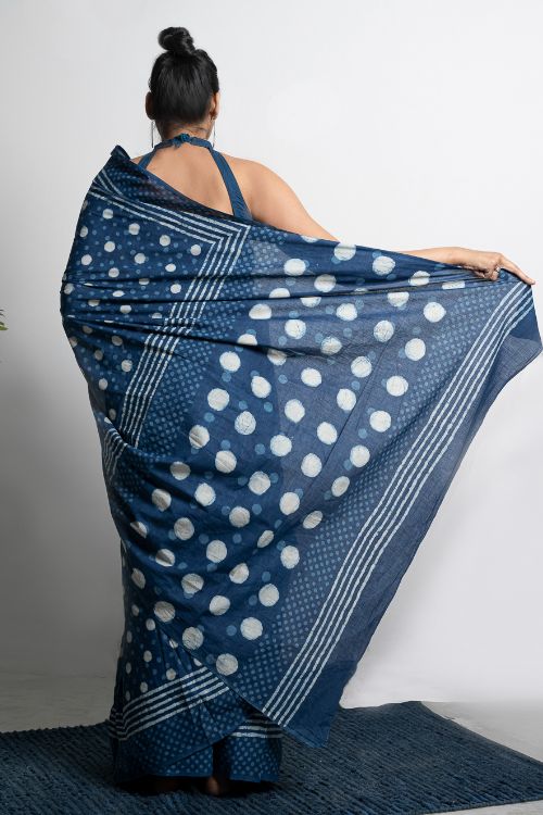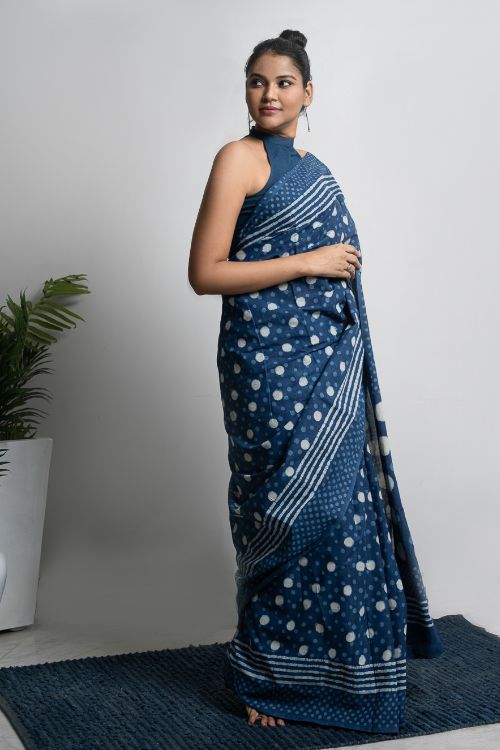 Blue Polka Saree with blouse piece. Striking and stunning in a lovely, vibrant blue Dabu printed Mulmul saree. Dabu printing is a resist dyeing process that entails the application of wax or gum clay mixed with resin to portions of the cloth, using a brush or block, followed by the application of colour. The wax is then washed off in hot or flowing water allowing the colour to seep into the wax treated portions of the fabric, similar to a batik process. This is then followed by block printing to define outlines and shapes. The wax application renders a broken appearance just like batik. Typically vegetable dyes are used, though these days synthetic colours are also used depending on the print requirement.