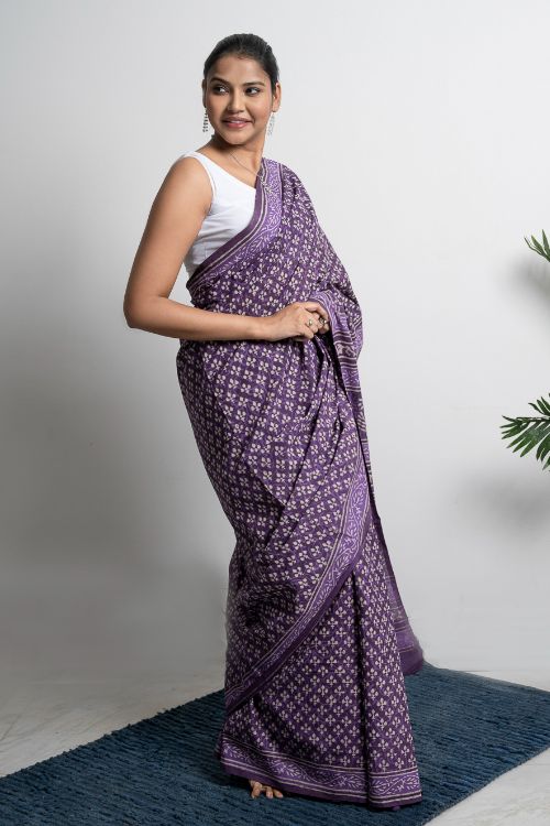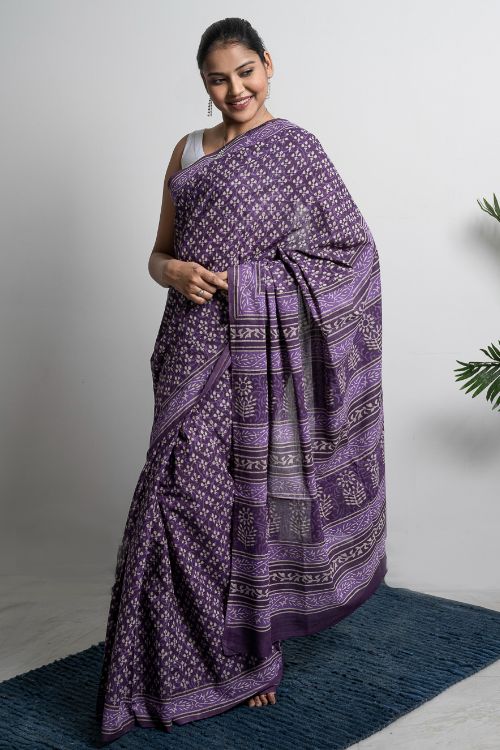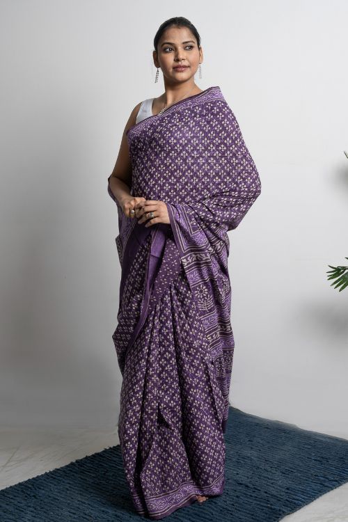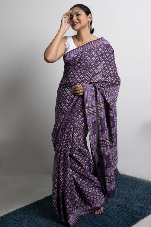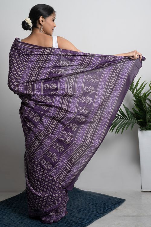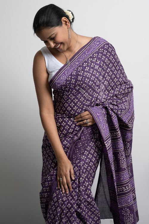 Purple Florets. Striking and stunning in a lovely, vibrant Green Dabu printed Mulmul saree with blouse piece. Dabu printing is a resist dyeing process that entails the application of wax or gum clay mixed with resin to portions of the cloth, using a brush or block, followed by the application of colour. The wax is then washed off in hot or flowing water allowing the colour to seep into the wax treated portions of the fabric, similar to a batik process. This is then followed by block printing to define outlines and shapes. The wax application renders a broken appearance just like batik. Typically vegetable dyes are used, though these days synthetic colours are also used depending on the print requirement.
