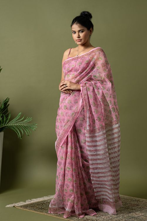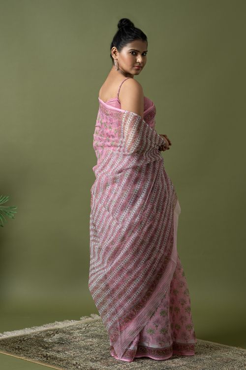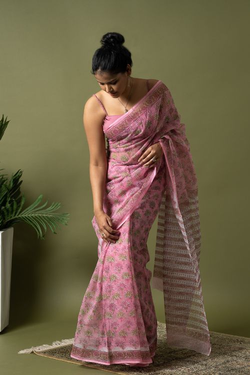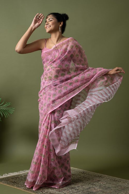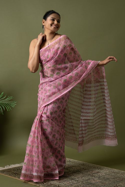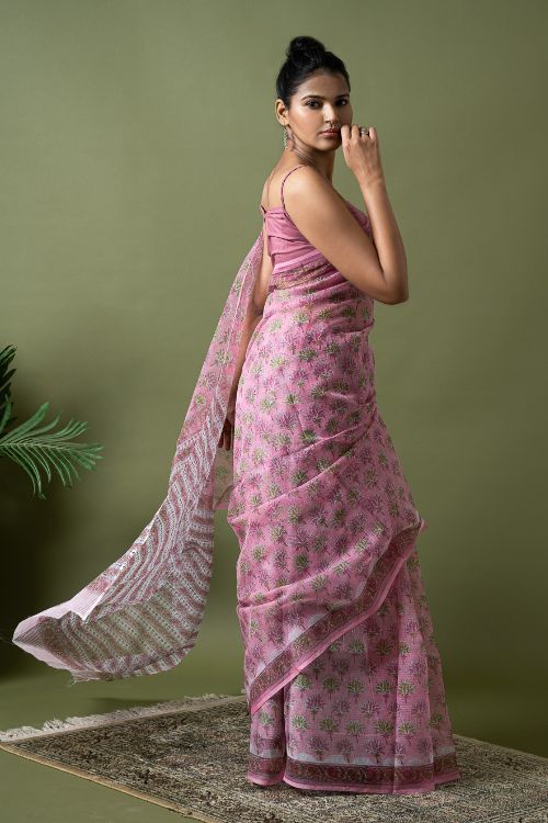 Pink Flora.Hailing from the village of Sanganer in Rajasthan and inspired by the beauty of the ancient, exquisitely landscaped ‘Baugs’ (gardens), this 500-year-old print is characterized by the usage of pale, subtle and tranquil colours with intricate and quite often enlarged standalone motifs (buttas) dominated by a variety of flora such as poppies, lilies, marigolds and sun flowers. In Sanganeri printing, the outline is printed first, followed by the inner motifs. The Sanganeri block printers are famed for their impeccable sense of aesthetics, finesse and ability in harmonizing the background colour of the cloth to that of the print to near perfection. Sanganeri prints are believed to have emerged in the 17th century when an number of craftsmen of that era migrated to Sanganer in Rajasthan, which by then was a thriving center of sun-dried dyeing processes. The then royal families of the state were the earliest appreciators of the art and under their patronage the craft flourished by leaps and bounds.