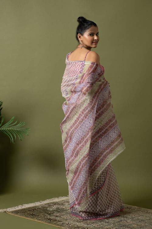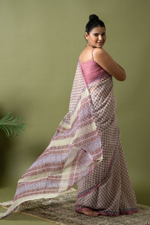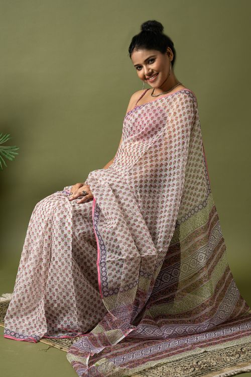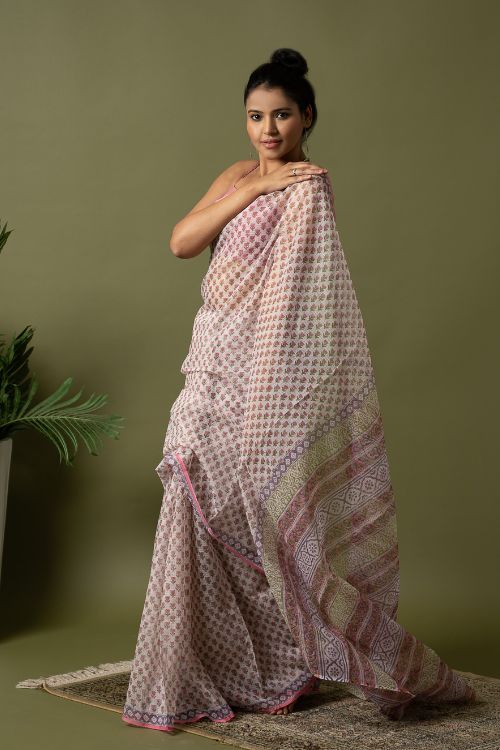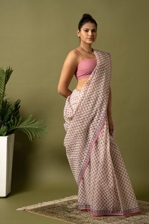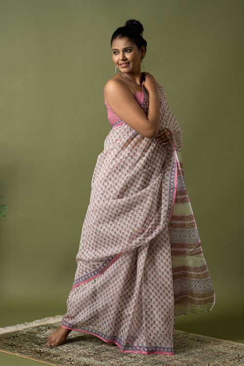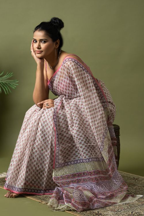 ICH Light & Breezy. Sanganeri Hand Block Printed Kota Doria - Pink Florets