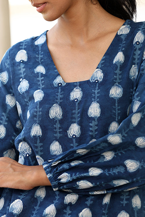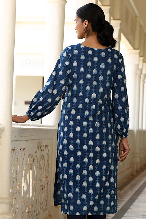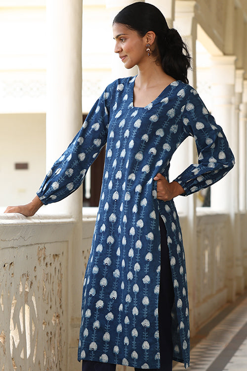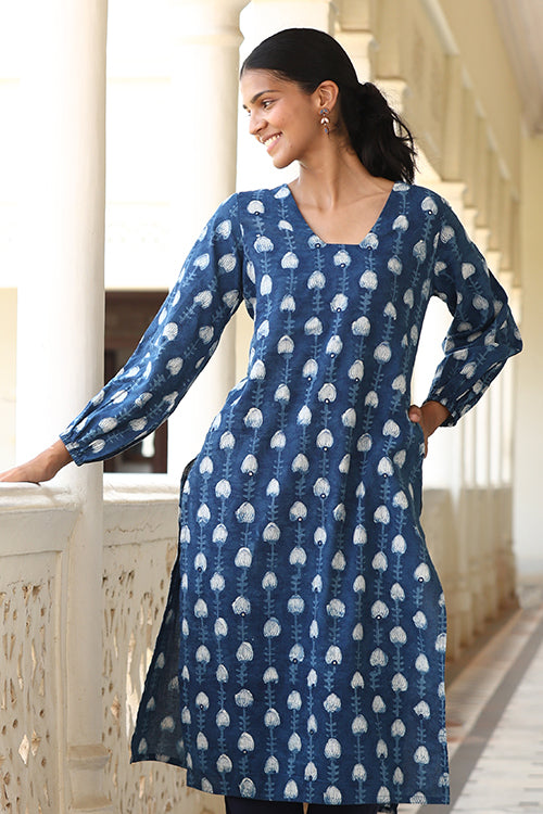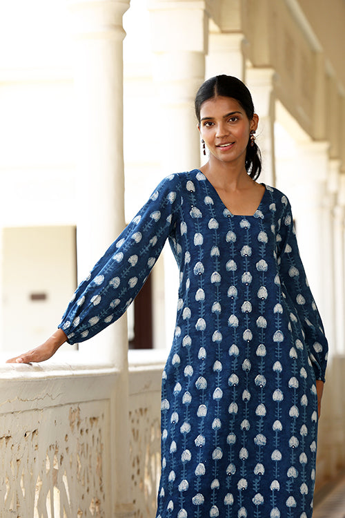 Step into elegance with the Okhai "Jharna" Hand-Embroidered Mirrorwork Pure Cotton Indigo Kurta. Handcrafted from pure cotton in a brilliant indigo shade, this kurta features striking mirrorwork on the glass neckline, reflecting light with every movement. The intricate handblocked motifs throughout add a unique touch, showcasing the skill of our artisans. Designed for both comfort and style, it includes elastication on the sleeve edges, a shoulder loop with press buttons, and two practical pockets on the sides. To the office or for a daytime event, this kurta offers the perfect blend of traditional charm and modern flair.