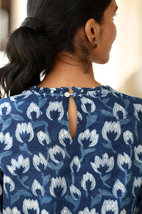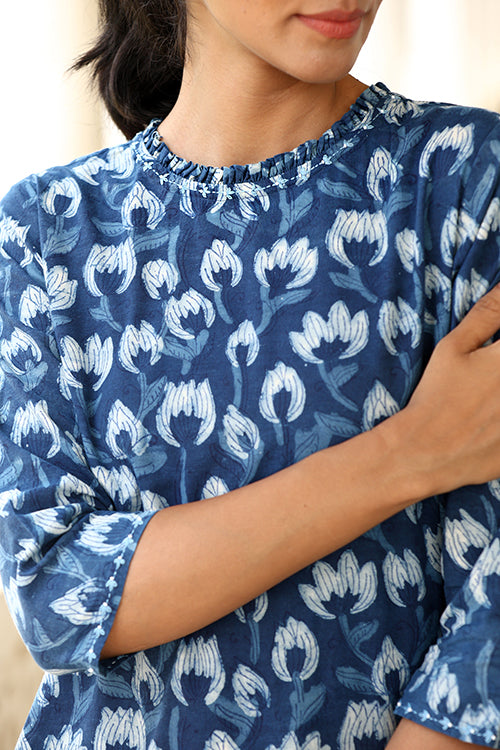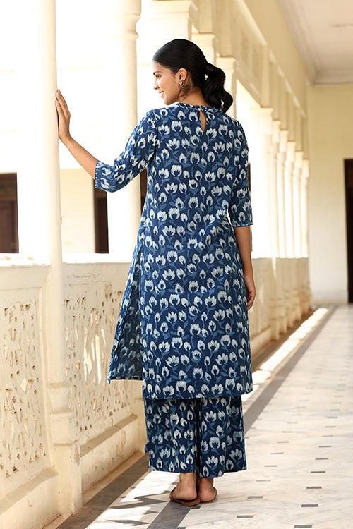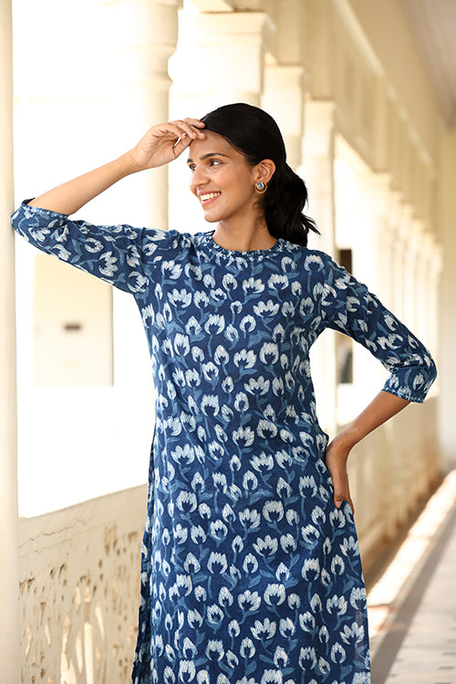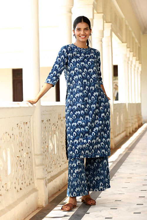 The "Tarang" Hand-Embroidered Beadwork Kurta Pant Set is a beautiful blend of tradition and contemporary style. Handcrafted from pure cotton in a brilliant indigo hue, this ensemble features exquisite floral motifs handblocked throughout by our skilled artisans. The kurta boasts a charming frill on the neckline, with delicate laisy daisy and running stitches adorned with white beads along the neck and sleeves. A loop with a Mother of Pearl button at the back adds a touch of elegance. The pants come with an elasticated back for a perfect fit and two convenient pockets. The "Tarang" set effortlessly combines comfort and elegance, making it a perfect choice for any occasion.