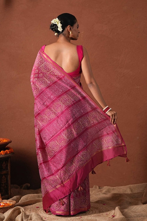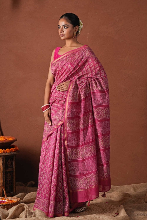 Unleash your festive spirit with our Azure Gold Hand Block Printed Chanderi Silk Saree. In stunning pink with intricate gold prints, this saree is perfect for any celebration. The soft chanderi silk fabric drapes elegantly, making it the ideal choice for any occasion. Elevate your festive wardrobe with this elegant piece! Pattern : Blockprint. The beautiful design is skillfully created using time-honored hand block printing techniques in gold prints perfect for the festive and ocassionwear. Fabric : Chanderi Silk. Chanderi silk is known for its fine quality, remarkable texture, breathability, and transparency. Length : 5.5 Mtr Saree with exclusive 0.8 Mtr Blouse Note: Blouse worn by model in pictures is for photoshoot only. Blouse piece provided with Saree is different than this and its complimenting the Saree prints.