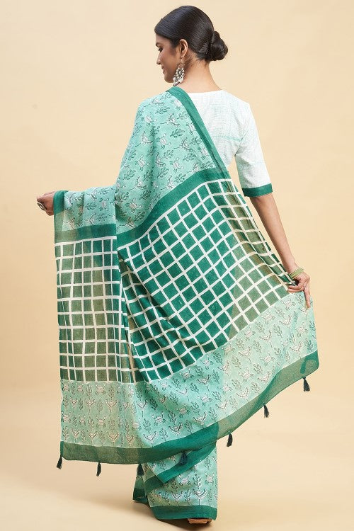 This "Crab In Green'' Block Printed Cotton Saree is crafted with pient handblock prints on buttery soft and delicately beautiful mul cotton. Experience the effortless draping and stunning design of this ancient block printing method, making it a perfect fit for Indian summer daily wear.