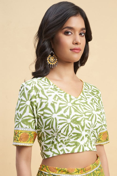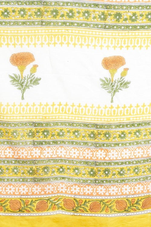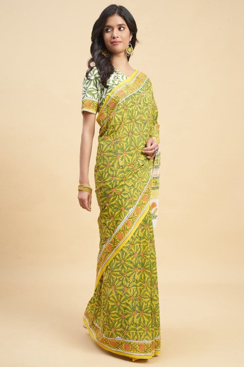 Experience the luxury of "Daffodil Green" HANDBLOCK PRINT MUL COTTON SAREE. Made from buttery soft mul cotton, this saree is not only delicately beautiful but also easy to drape. Featuring vibrant handprinted block prints, it combines ancient techniques with modern style. Stay comfortable and stylish this summer with this breathable and vibrant saree.
