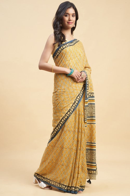 "Embrace the timeless beauty and comfort of our "Excelsa" Mul Cotton Saree. Crafted with delicate Pient Handblock prints, this saree is made from a buttery soft, breathable fabric - perfect for daily summer wear. Experience the simple yet stunning art of block printing with vibrant and bold designs. Draping has never been easier with this fine and luxurious fabric. Add this ancient beauty to your wardrobe today!"
