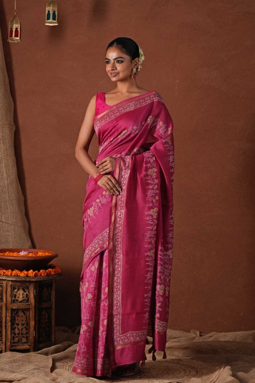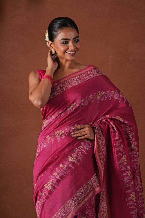 Indulge in tradition and elegance with our Golden Dawn Hand Block Printed Chanderi Silk Saree. This lovely pink saree is perfectly adorned with intricate gold printing, making it the ideal choice for festive occasions. Made from soft chanderi silk, it offers both comfort and style. Elevate your wardrobe with this stunning piece.