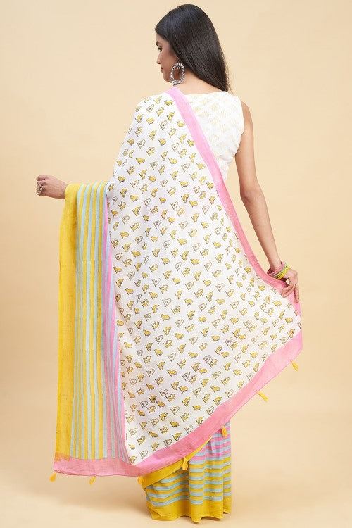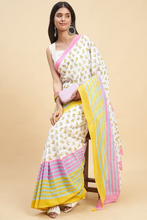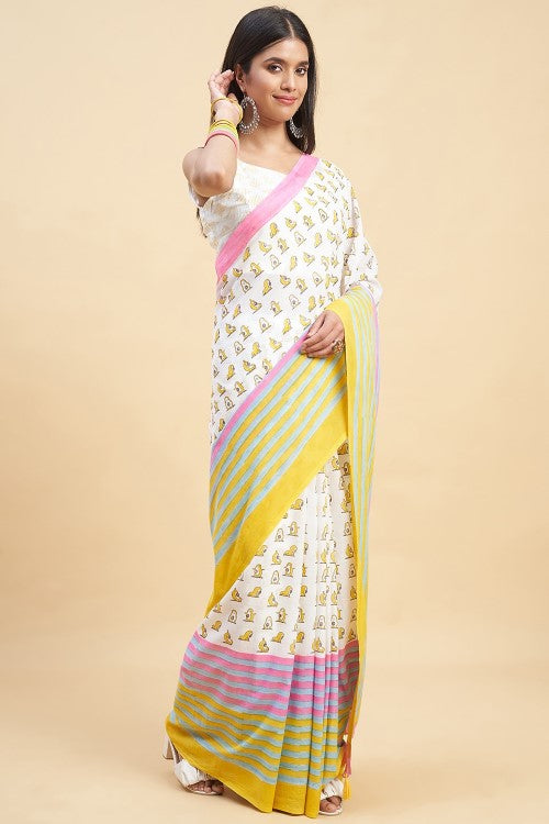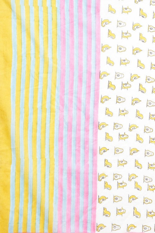 Experience the luxury of mul cotton in our "Little Yellow Penguins" saree. Handcrafted with pient handblock prints, this buttery soft and delicately beautiful fabric makes draping a breeze. The ancient art of block printing brings vibrant and bold designs to life on this comfortable and breathable saree. Perfect for Indian summers.