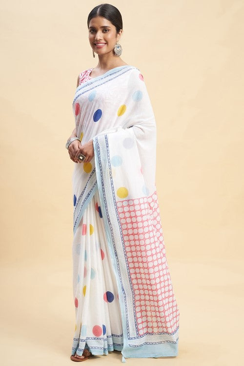 Indulge in the luxurious softness of the Ocean Pearls Block Printed Cotton Saree. Crafted with delicate Mul cotton, draping this saree is a breeze. The buttery smooth fabric is adorned with vibrant and bold Pient Handblock prints, a traditional art form that still captivates today. Perfect for warm Indian summers, this saree is both comfortable and breathable for daily wear.