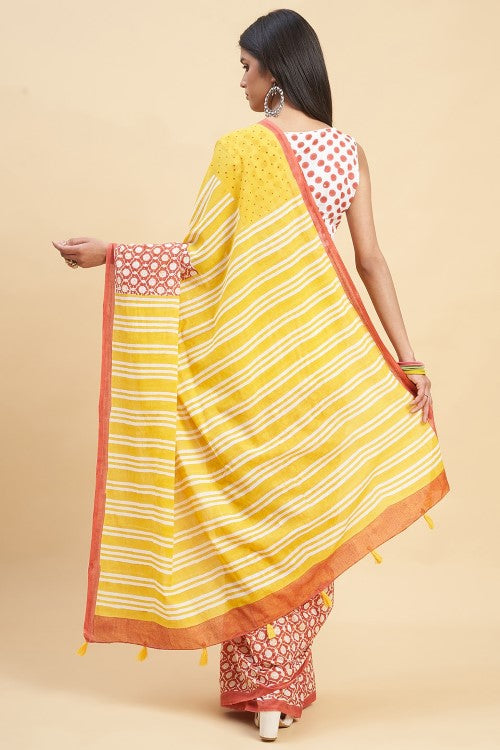 Get ready to be swept away to paradise with our "Paradise Yellow" Handblock Print Mul Cotton Saree. Experience the luxury of buttery soft mul cotton, delicately crafted into a beautiful saree with vibrant and bold pient handblock prints. Perfect for Indian summers, this saree is not only comfortable but also a true work of art.