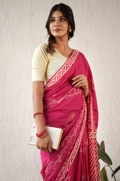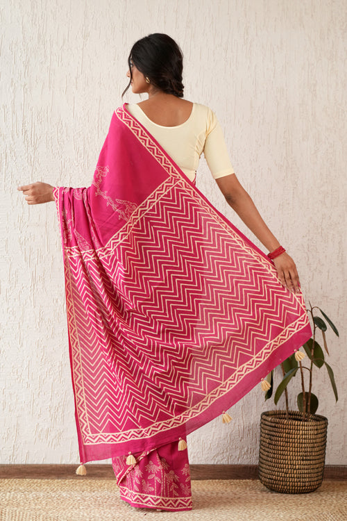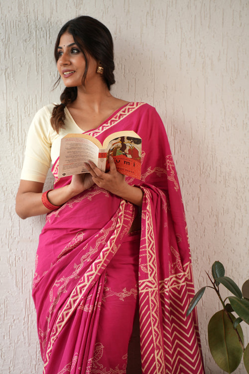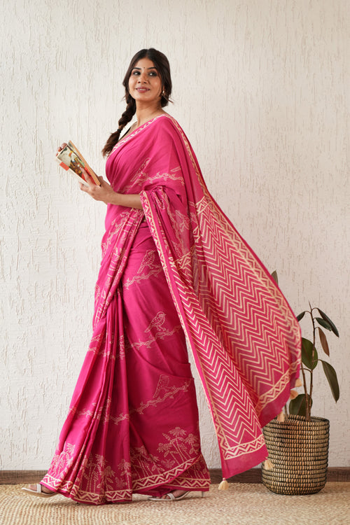 Indulge in the ethereal beauty of the Twilight Harmony Hand Block Mul Cotton Saree. Hand block printed and adorned with a delicate pink color, this saree exudes grace and elegance. Made from soft pure mulmul cotton, it is breathable and comfortable, perfect for officewear. Elevate your style with this exquisite saree. Pattern : Discharge Blockprint. Discharge printing, also known as extract printing, is a fabric printing technique that involves applying a color-destroying agent to dyed fabric to create a white or light-colored pattern on a darker background. The process is similar to bleaching. The result is a design that uses the original hue or a replacement color as a pattern against the colored ground. Discharge printing is a good choice for comfort and the environment, and that it can create vintage and distressed designs. Fabric : Mul cotton, also known as muslin cotton, is a lightweight, breathable, and soft fabric that originated in the Indian subcontinent. It's made from finely woven cotton yarns, giving it a sheer, feather-like finish that's ideal for hot climates. Mul cotton has been prized for its versatility and comfort for hundreds of years. Length : 5.5 Mtr Saree with exclusive 0.8 Mtr Blouse Note: Blouse worn by model in pictures is for photoshoot only. Blouse piece provided with Saree is different than this and its complimenting the Saree prints.