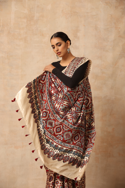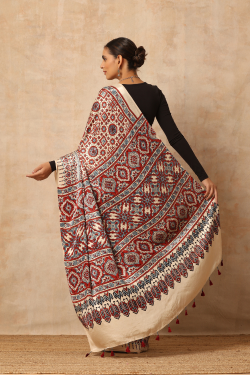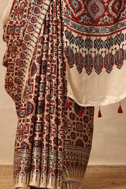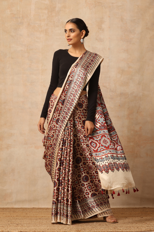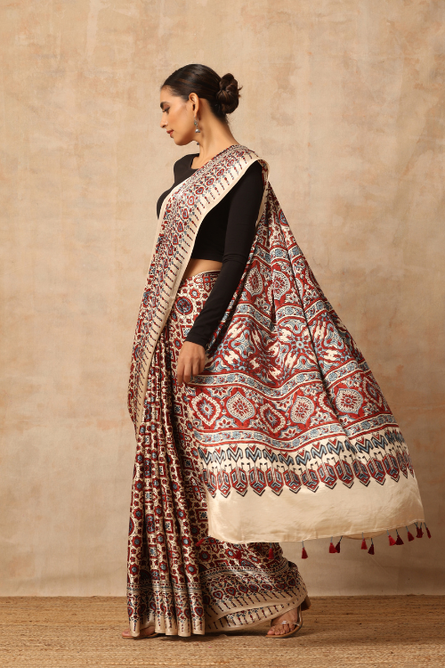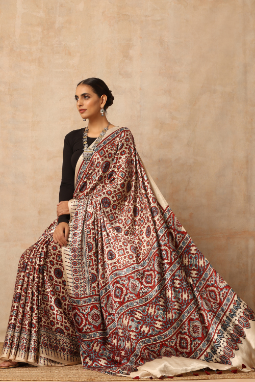 Tenaaro Ajrakh Hand Block Printed Modal Satin Saree