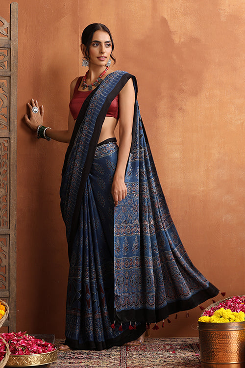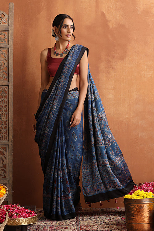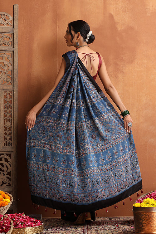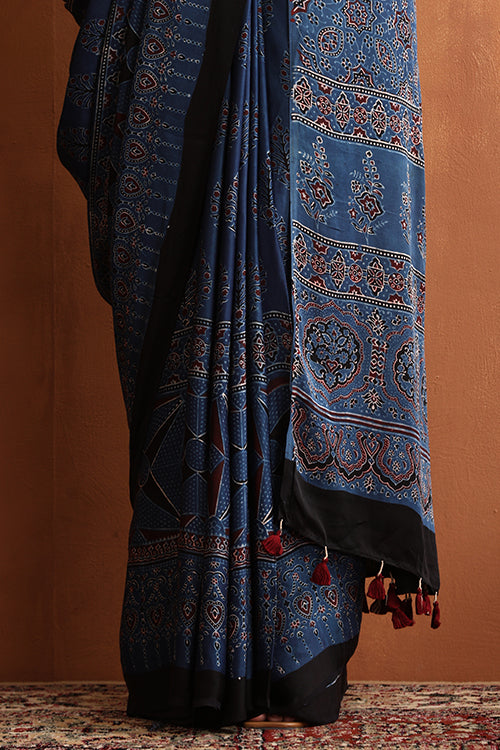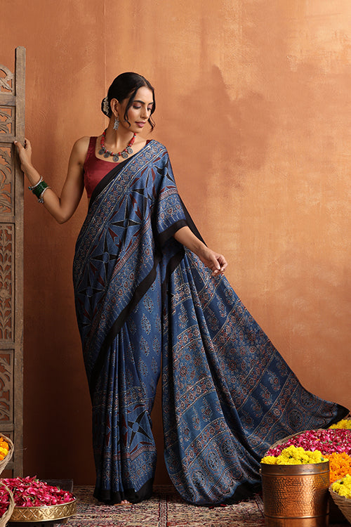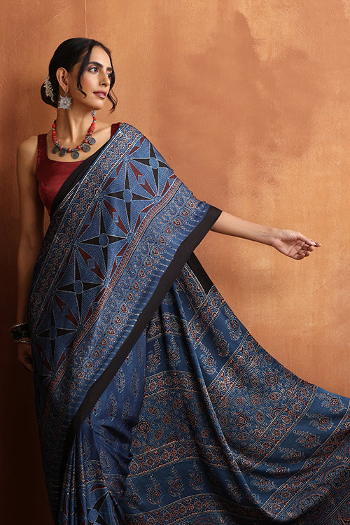 TENAARO Ajrakh Hand Block Printed Modal Satin Saree