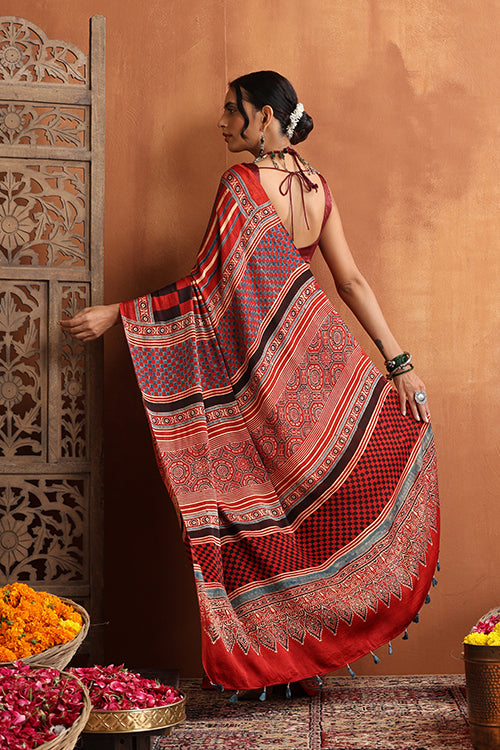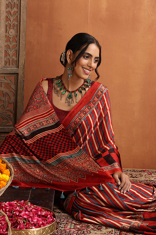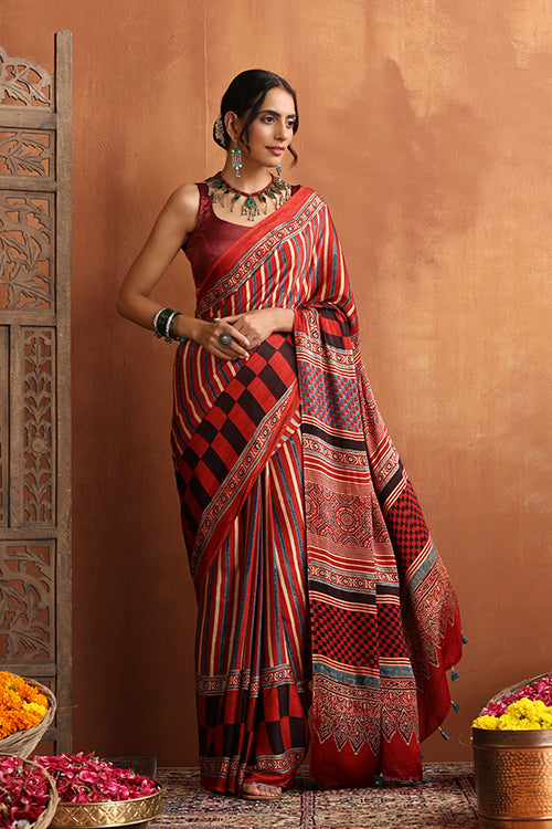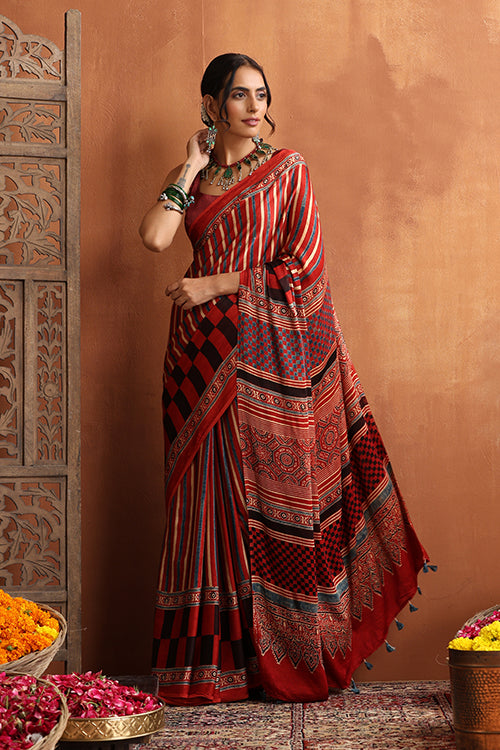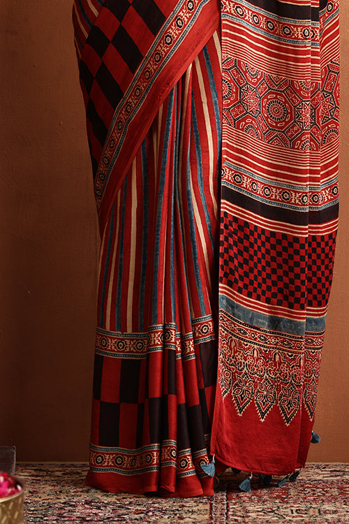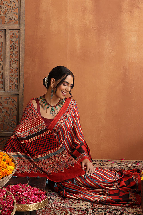 TENAARO Ajrakh Hand Block Printed Modal Satin Saree