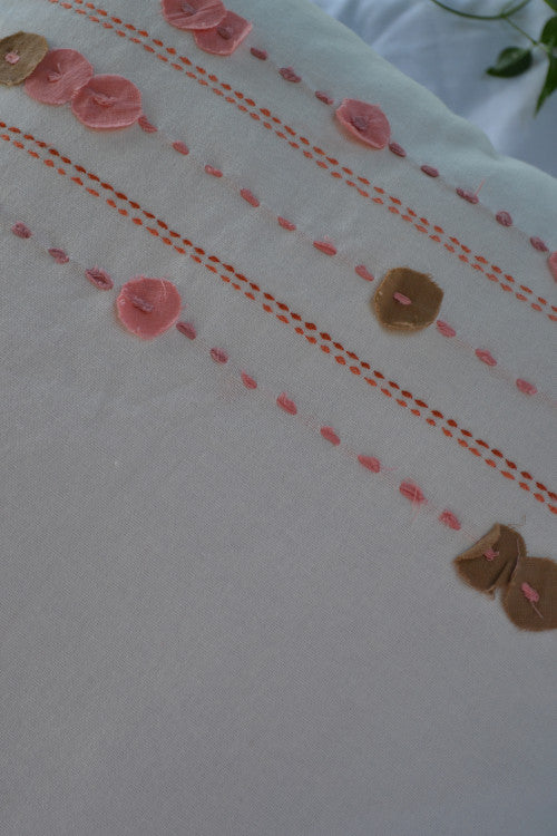 This cushion cover is part of the collection called 'Living Coral A'. It is white in colour. It has elegant hand embriodered stitches and embellishments in upcycled organic cotton fabric and thread in living coral colour. It is 40cm x 40cm in size and made of 100% cotton. It will look great in groups of single design, as well as a collection of four.