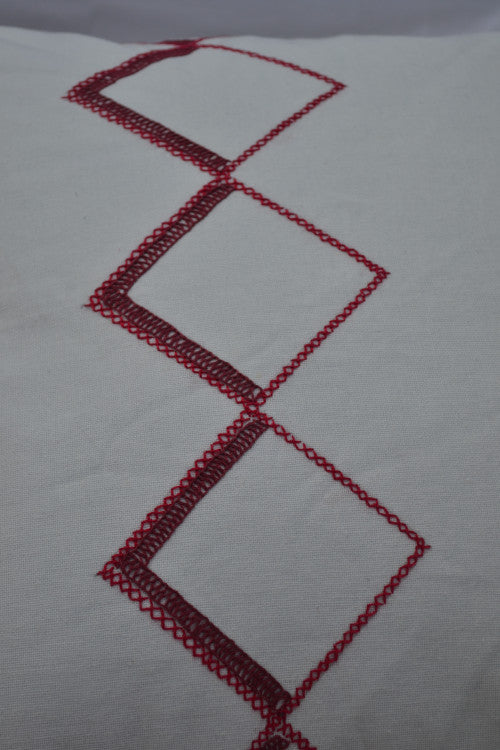 This cushion cover is part of the collection called 'Living Coral B'. It is offwhite in colour. It has minimalistic hand embriodery in shades of red in geometrical diamond shapes. It is 40cm x 40cm in size and made of 100% cotton. It will look great in groups of single design, as well as a collection of five.