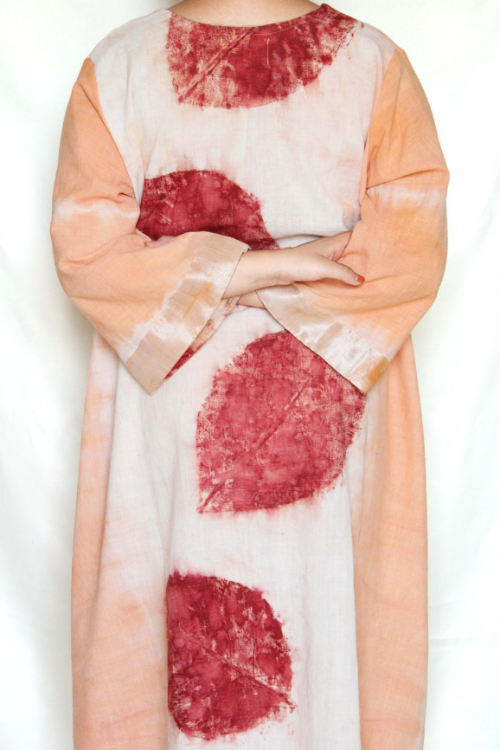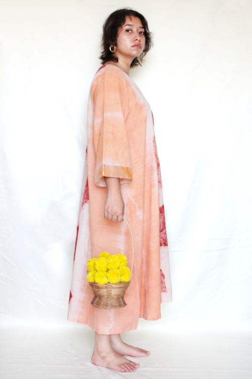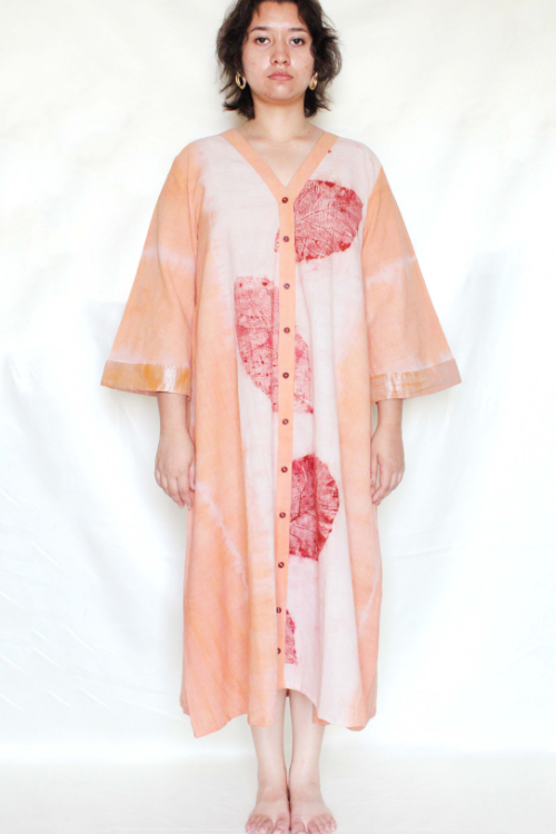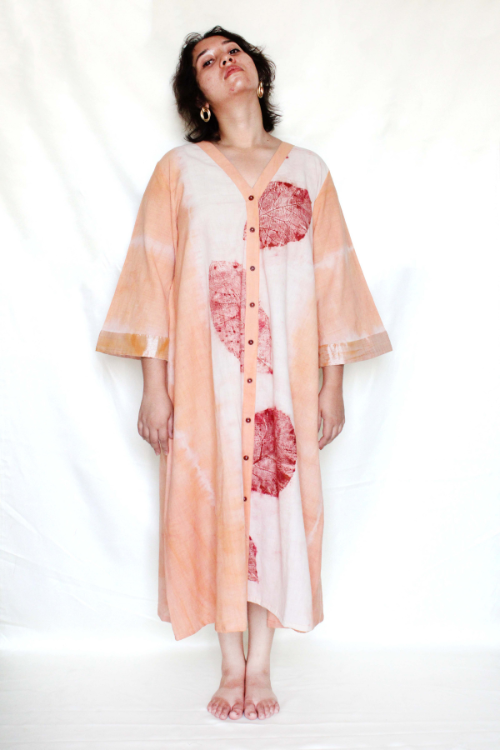 Bageeya's "Rani Rang" button-down dress embrace's comfort and sustainability. Crafted from locally-sourced Organic cotton, this dress is incredibly soft and flows beautifully with every move. Feel confident and happy in a garment that's kind to your skin and the planet. Rani Rang Button down dress goes beyond style. We use a unique natural dye extracted from sacred temple Manjishta and Khakhra leaves by trained artisans. This eco-conscious approach not only creates vibrant colors but also helps reduce marine pollution caused. The Organic cotton fabric, incredibly soft and breathable, is sourced from local artisans of Kutch, Gujarat, ensuring responsible production and supporting our community. Rani Rang is versatile dress flatters all body types. The relaxed, button-down design allows for easy layering, while the flowing silhouette drapes beautifully. Three-quarter length bell sleeves add a touch of femininity and elegance. Embrace a comfortable fit that hugs your curves in all the right places, making you feel confident and happy throughout the day. Our Button down dress is your new wardrobe staple! Dress it up with heels and statement jewelry for a special occasion, or keep it casual with sandals and a denim jacket. Let the vibrant colors and effortless drape be the star of the show. It's perfect for any season, layered with a cardigan in cooler weather or worn solo on a warm day.