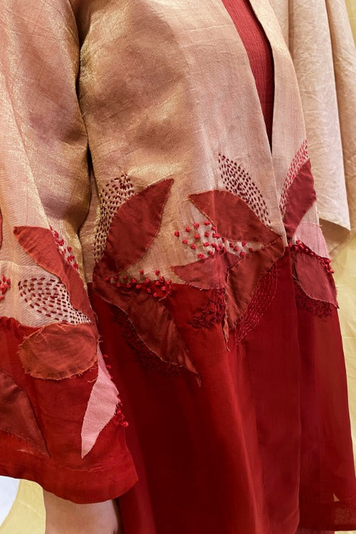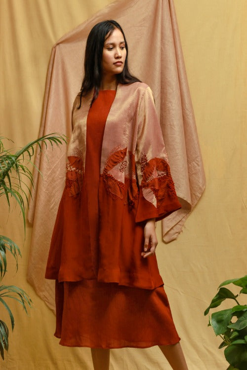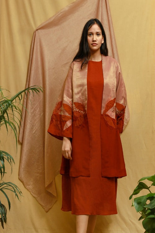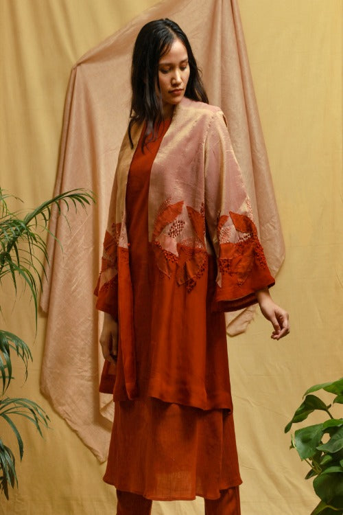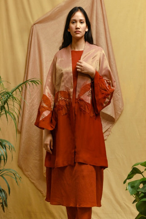 DESCRIPTION Reflecting on a soft way of skills that triumph an Indo-Persian heritage blended with the cultural virtues of our Artisans. This timeless yet cheerful set is handcrafted from skin friendly fabrics and is designed to stand out and yet keep you comfortable. Wear this as a poetic expression of intimate festivities that you can dress up or down as you please! Play with it as separates and team each piece up with something you already own. Jacket * Statement sleeves. * Delicate hand applique and thread embroidery * Comfort fit. * Boxy fit * Jacket Length - 36 * Jacket Material - Tissue and Pure hand woven Chanderi Slip Dress * Straight fit * Strappy Sleeves * High slit * Length: 42 inches. * Made with silk crush * Lining cotton * Consciously made. PANTS * Elasticated back with a concealed drawstring in the front. * Straight fit. * Side pockets. * Ankle length. * Length: 37 inches. * Woven with Silk Crush * Ethically made. ABOUT OUR FABRICS Our silks are made from bamboo and wood pulp, dyed using natural pigments. Our breathable and lightweight fabric offers a high sense of ease. Why is it earth friendly? Because the pigments used in the dyeing process are derived from fruits, vegetables, roots, berries and minerals and the fabric has a longer life cycle than traditional silk, which means it is easy on our planet. WHY CHOOSE US .At Chambray & Co. we honour the lives of everyone who has invisibly contributed to what we wear, consciously, at every stage of crafting our products. Shifting fashion to touch the soul instead of just the body, we believe life is interconnected. The process of creation is as precious to us as giving you a beautiful product. We honour flaws in weaving as part of honouring life, streak of shade in dye as true luxury of the handmade. We silently celebrate the fading of natural dyes as we gracefully watch ourselves change through time. We design for mortality while honouring life and nature.
