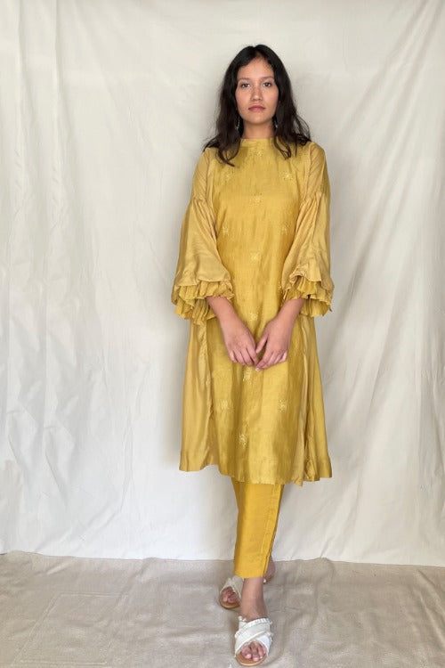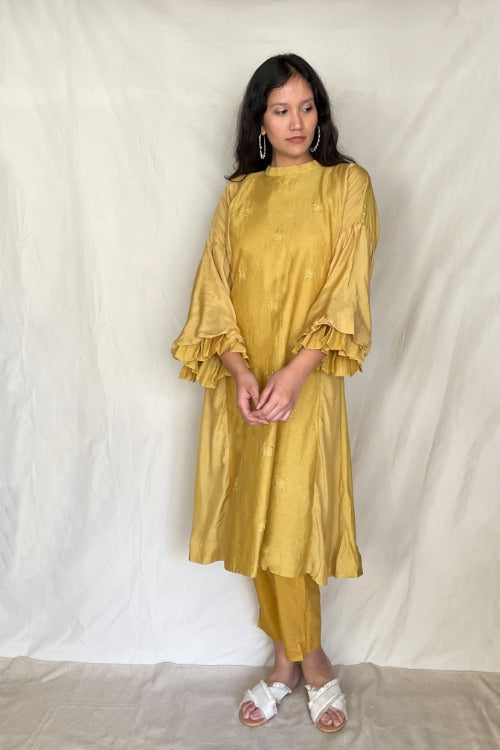THIS ITEM IS NON - RETURNABLE.DESCRIPTION Being in a state of reverence, is a bliss to be a part of. Wear this as a poetic expression of intimate festivities that you can dress up or down as you please! Tunic * High neck * Delicate beaded emboidery *Statement sleeves *Patched with cotton panels *Straight fit * Comfort fit. * Length - 44" * Made with Pure Cotton and Plant based vegan silk Jacket * 3/4th sleeves jacket * Front Buttoned *Cuffed sleeve PANTS * Elasticated back with a concealed drawstring in the front. * Narrow fit. * Side pockets. * Ankle length. * Length: 37 inches. * Made with Pure Cotton * Ethically made. ABOUT OUR FABRICS Our silks are made from bamboo and wood pulp, dyed using natural pigments. Our breathable and lightweight fabric offers a high sense of ease. Why is it earth friendly? Because the pigments used in the dyeing process are derived from fruits, vegetables, roots, berries and minerals and the fabric has a longer life cycle than traditional silk, which means it is easy on our planet. WHY CHOOSE US .At Chambray & Co. we honour the lives of everyone who has invisibly contributed to what we wear, consciously, at every stage of crafting our products. Shifting fashion to touch the soul instead of just the body, we believe life is interconnected. The process of creation is as precious to us as giving you a beautiful product. We honour flaws in weaving as part of honouring life, streak of shade in dye as true luxury of the handmade. We silently celebrate the fading of natural dyes as we gracefully watch ourselves change through time. We design for mortality while honouring life and nature.
