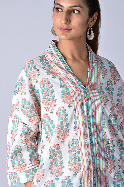 This hand block kurta has been inspired Kaaftan for comfortable styling , featuring V-neck, 3/4th sleeves, functional side pockets and a beautiful lace detailing on it's seam. It comes highlighted with careful knotted embroidery with sequins work around it's neckline, pintucks and hand stich detailing on it's sleeve opening. Being crafted from cotton it is comfortable to wear. Either pair it with pants of your choice or can also be worn as a dress.