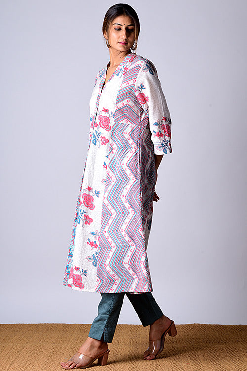 Styled in an A-Line silhouette, this hand block printed kurta features front open style with button closure, V-neck, 3/4th sleeves and functional deep pockets add value to this garment. It comes highlighted with careful hole weeding embroidery work on it's hands. Being crafted from cotton it is comfortable to wear. Either pair it with pants of your choice or can also be worn as a dress.
