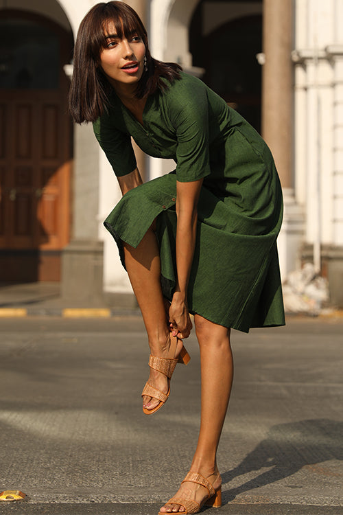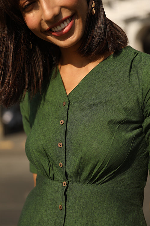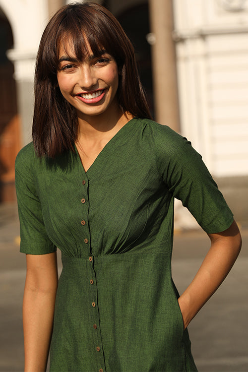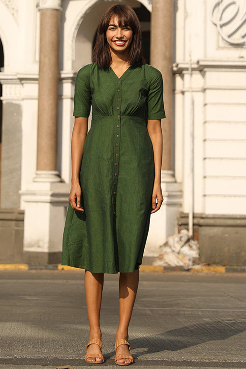 Epitome of femininity is our ‘Parakeet’ in a beautiful forest green colour. Crafted from pure cotton fabric and with a silhouette so cool, this dress will flatter you from all angles. This piece has a classic V-neck easy for accessorising and two pockets for your essentials. The wooden buttons lined along the functional placket are a great highlight. The soft gathers along the waist will ensure a shapely look. Get this sensational piece before it sells out!