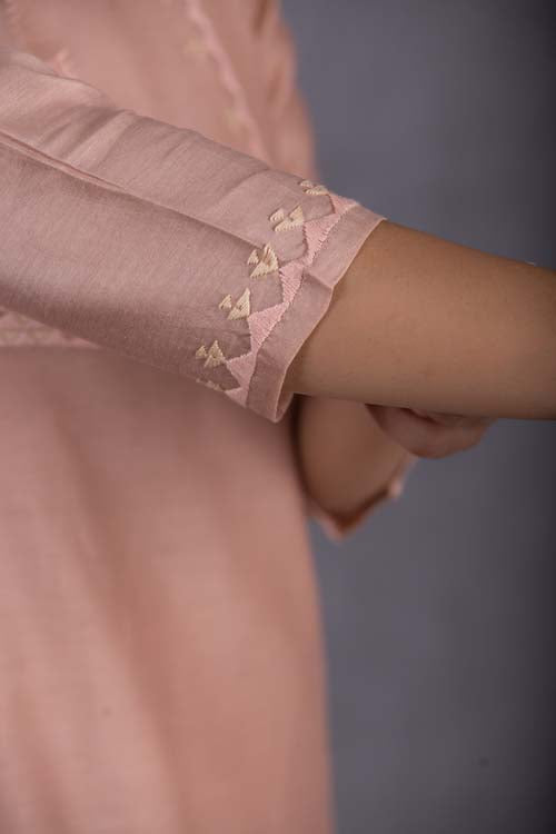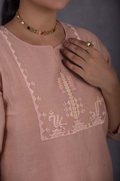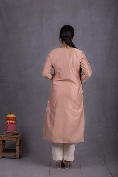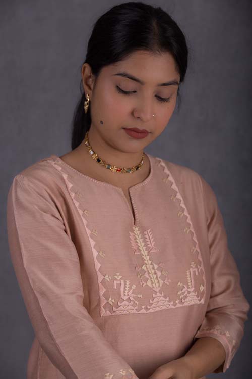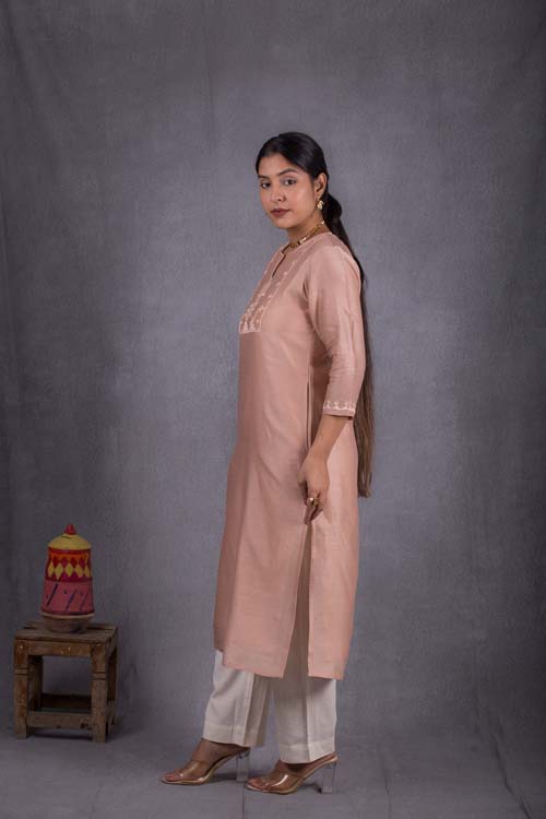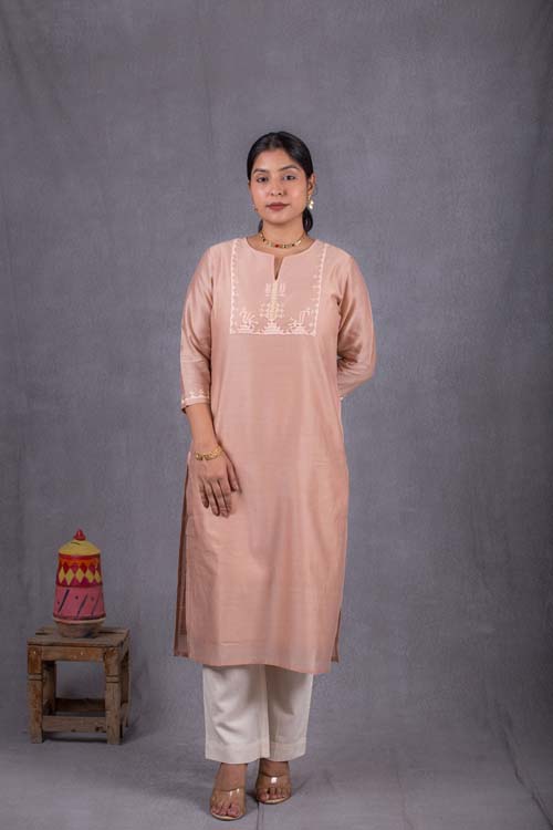 Elevate your wardrobe with the Priyanka Kurti, a masterpiece in Dark cream Chanderi fabric that marries timeless elegance with a contemporary twist. The delicate Soof embroidery gracing the yoke and sleeves tells a story of the Thar Desert, brought to life by the skilled hands of our artisans.