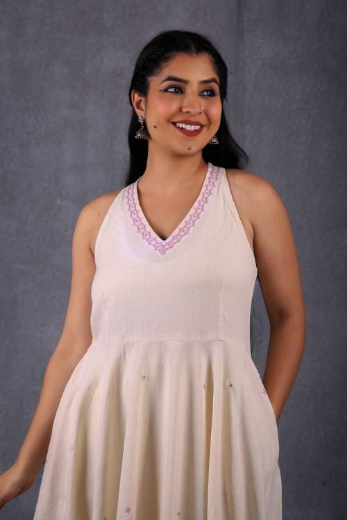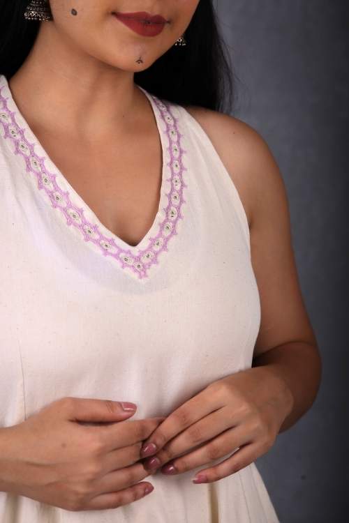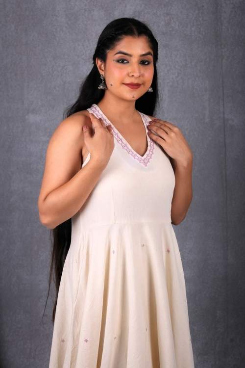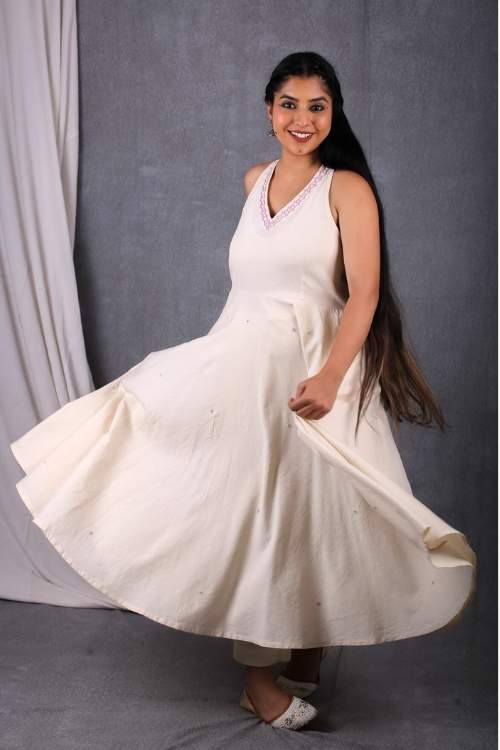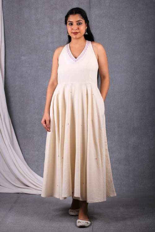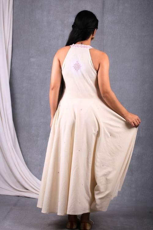 Introducing the Banjara 3.0 craftsmanship with our Sankhu, a celebration of heritage and contemporary style. This Dress features an A line fit silhouette, made from the finest natural-white handloom fabric woven by the skilled hands of Thar weavers from Pugal, Bikaner. The halter neck design adds a contemporary twist to this classic silhouette, making it a standout piece for any occasion. The dress includes practical pockets and a flowing circular pattern that creates a graceful, flattering shape. Perfect for festive events or elegant gatherings, this dress combines the beauty of traditional embroidery with modern style.