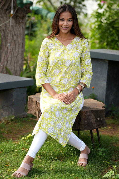 Introducing our ethereal "Verdant Valley" print kurti, a captivating fusion of delicate blooms and refreshing hues. This enchanting theme features a harmonious combination of white florals on a light green background, creating a serene and graceful design inspired by nature's elegance. With Sootisyahi, you can embrace sustainable fashion without compromising on style. The use of azo-free dyes ensures a safer and more eco-friendly production process, allowing you to wear this kurti with confidence and pride. Each kurti is meticulously handcrafted by skilled artisans, ensuring attention to detail and a unique touch. The hand block printing technique adds an element of artistry and authenticity to the dress, showcasing the beauty of traditional craftsmanship. The flowing silhouette enhances the feminine charm, while the intricate floral patterns add a touch of grace and allure.