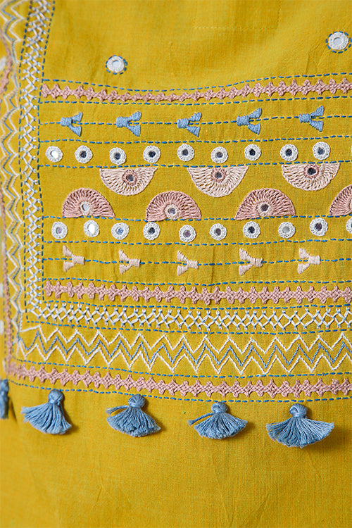 Be it a family get-together or an outing with friends, our warm yellow 'Magical Music' kurta and pant set will come in handy for any special occasion. A heavily embroidered yoke with mirrors intricately & potli in the front adorn the kurta arranged in a beautiful pattern, reflecting soft femininity. It is further decorated with embroidery and mirrorwork at the sleeves. The monochromatic pants that come with the set feature concealed pockets and elastication at the back and a drawstring all around for added comfort.