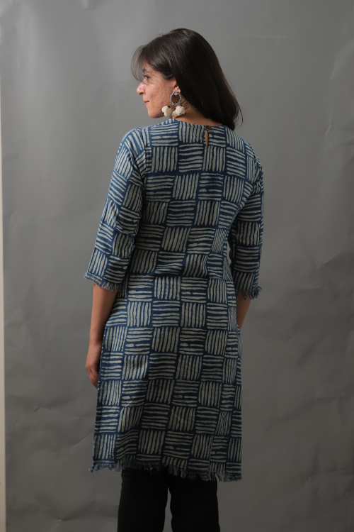 Moralfibre Natural Indigo Cane Printed Kurti With Raw Edges