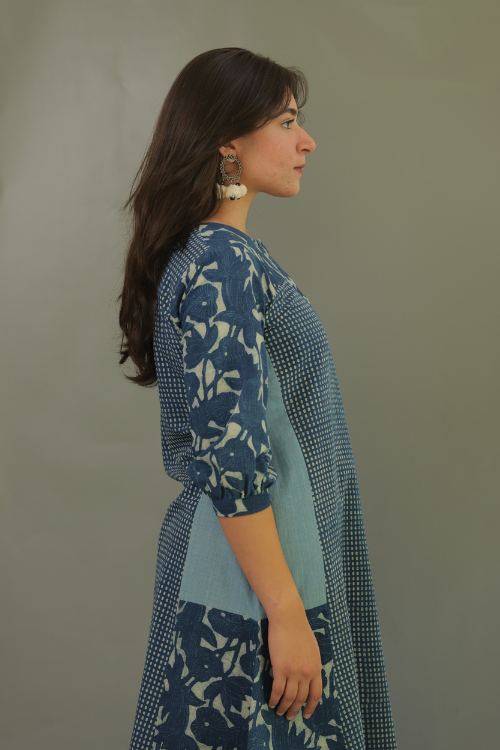 Moralfibre Natural Indigo Multi Print Dress With 3/4Th Sleeves