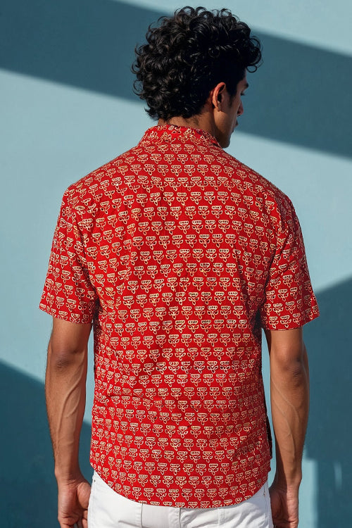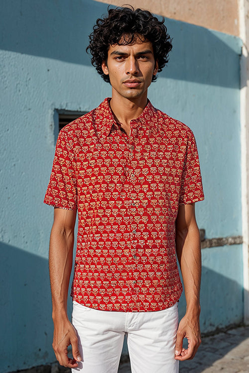 Comfort and effortless fashion done right in our "Retrograde" Pure Cotton Shirt. It's as soothing to the skin in the heat as it is pleasing to the eyes with Lotus flower motifs block printed patiently all over the canvas. This collared shirt comes with simple wooden buttons on a functional placket. Be it a day out with the boys or for a resort look, pair with denims or khaki shorts and ace the breezy look!