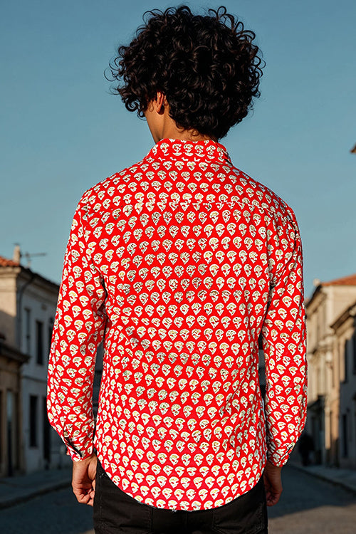 Get in touch with your ethnic roots as you put on our "Vanguard" red handblock printed shirt. Made from pure cotton fabric, this smart shirt has eye-catching flower prints all over it. It comes with a functional placket with simple wooden buttons on it, on the cuffs and also, on the biceps. The full sleeves and the collar make it workwear-appropriate. Fold the sleeves up and pair them with some khaki shorts, now you're set for your resort getaway. Be it any situation, "Vanguard" keeps you comfortably stylish!
