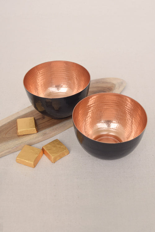 Delightful little bowl. Rose gold on the inside, jet black on the outside. Handcrafted by our coppersmiths. Size: 11cm dia x 7.6 cm ht. Material: Copper with a clear lacquer coat and a black finish on the outside. Delivery Period: 1 Week. Care Instructions: To clean your lacquered decorative copper products wipe clean with a moist soft cloth.Do not scrub your lacquered copper products or use any kind of detergents on it.